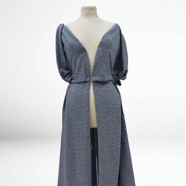 Splendido Cotone per Abbigliamento con fondo blu e disegni bianchi è utilizzato per la produzione di abbigliamento adatto per vestaglie, pigiami e abbigliamento da notte.