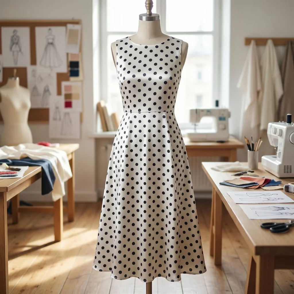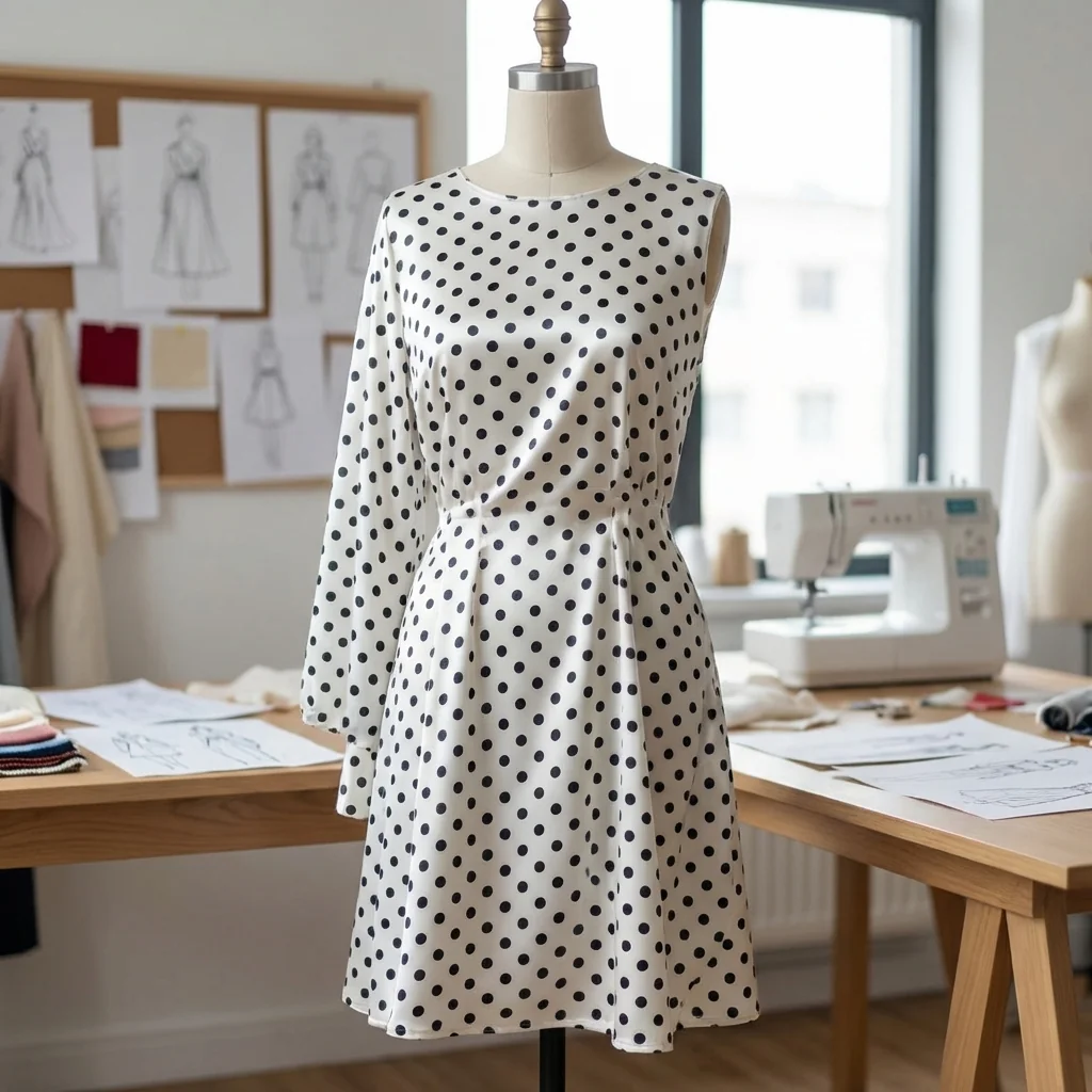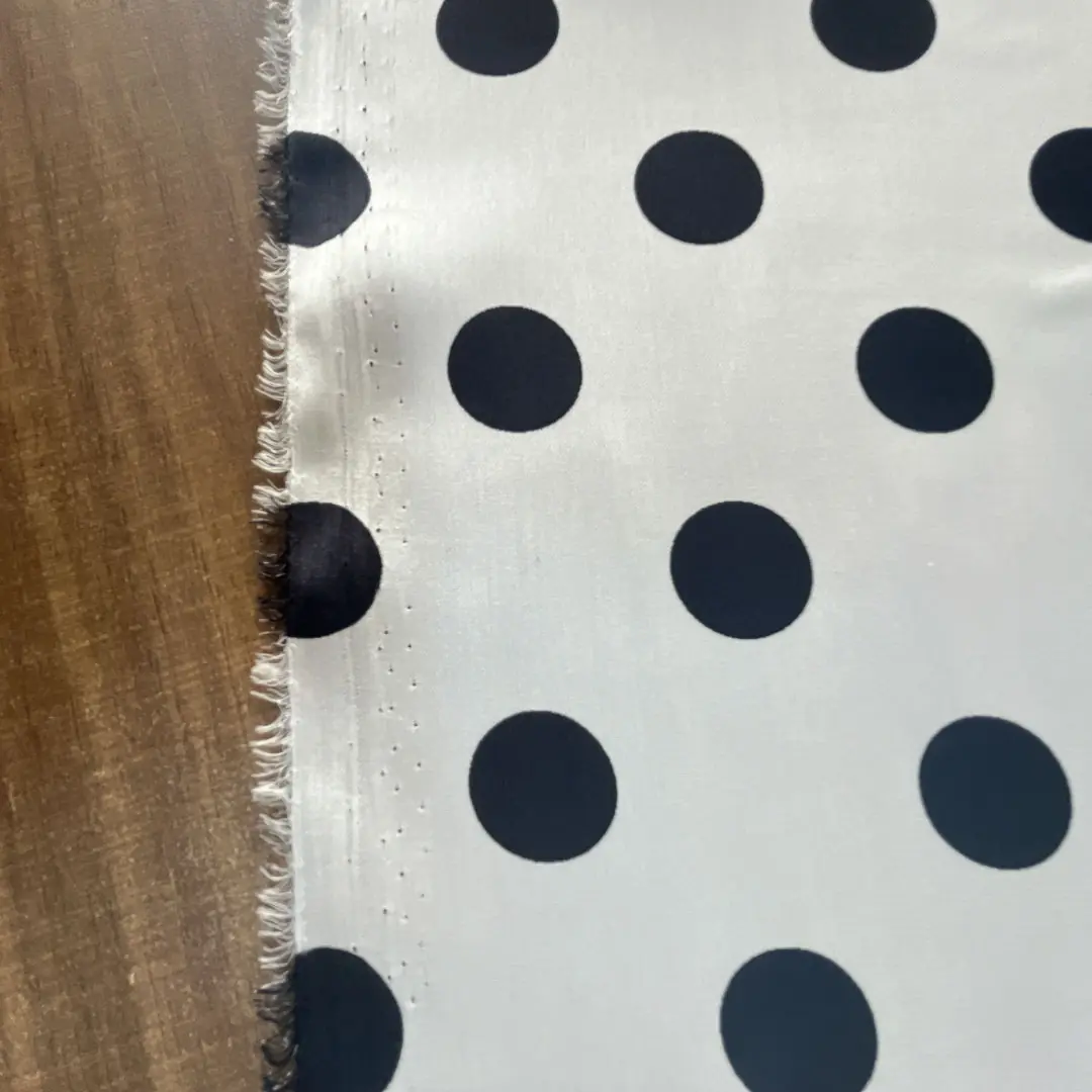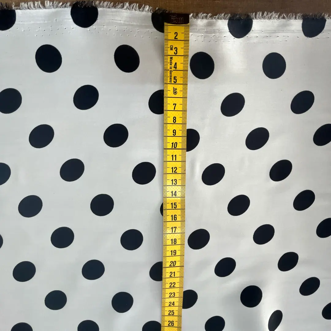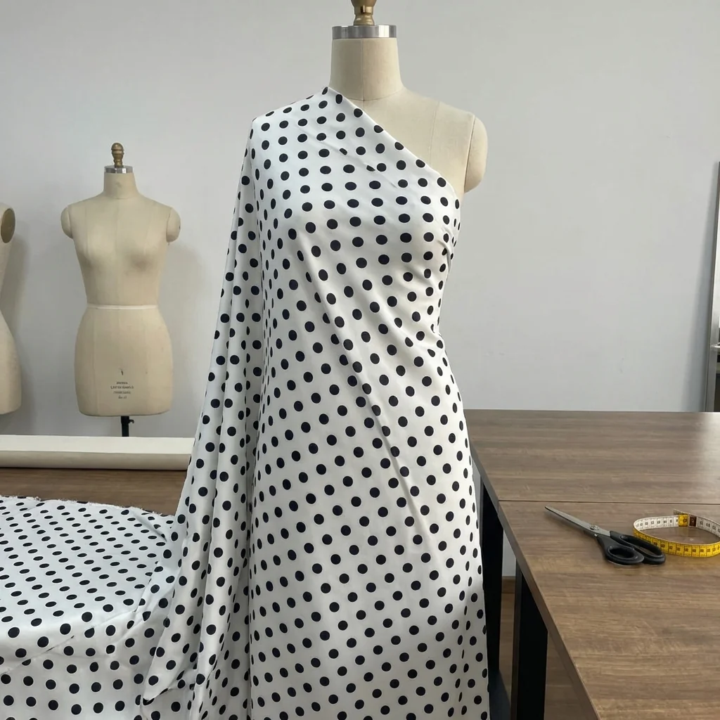 Tessuto in visscosa di raso leggermente lucido coprente a pois a adatta alla stagione primaverile ed estiva, è disponibile nel colore bianco a pois nero.
