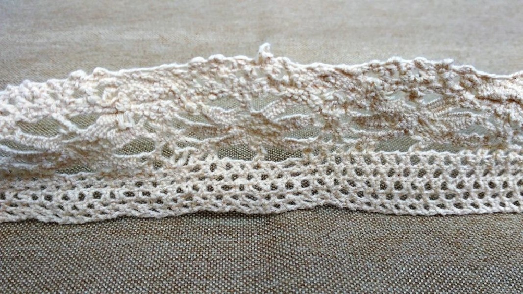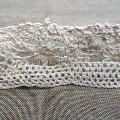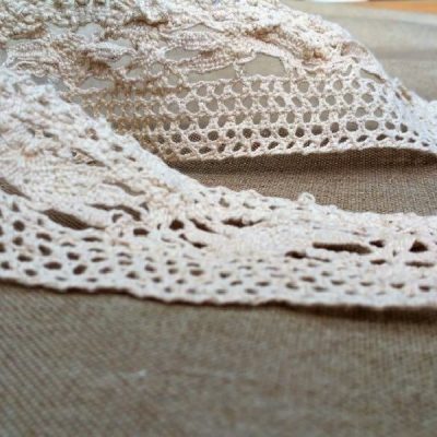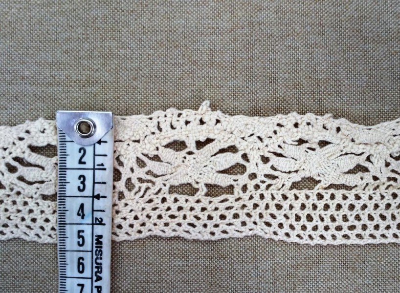 Balza di pizzo in macramè a motivo floreale con sfondo a rete, di colore ècru.
