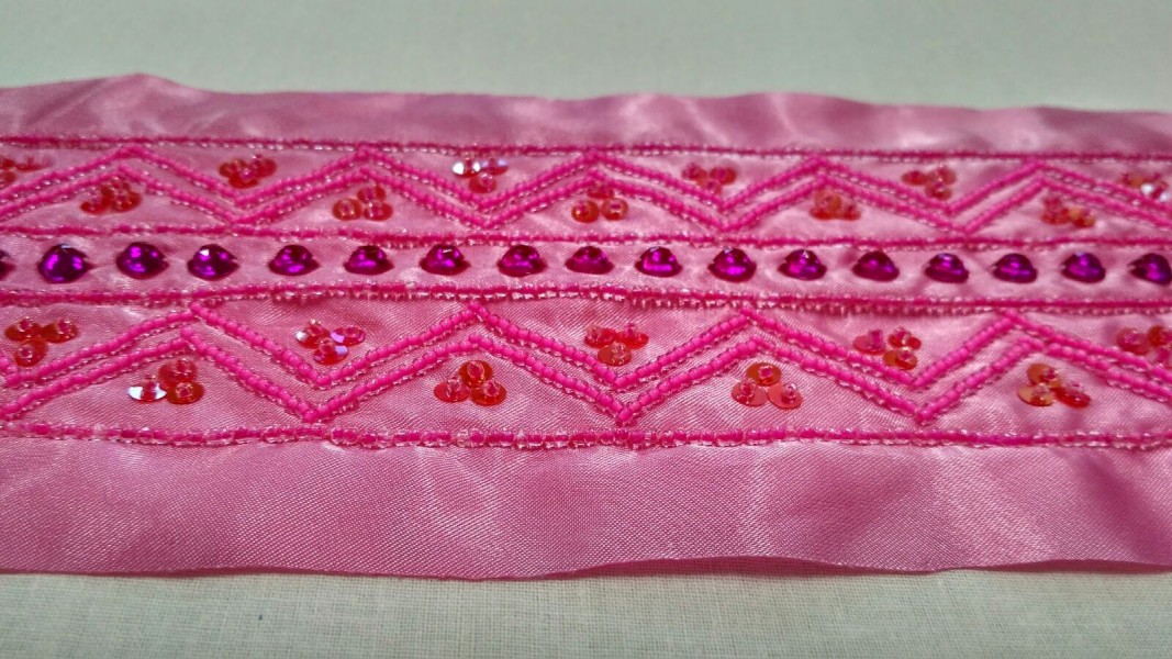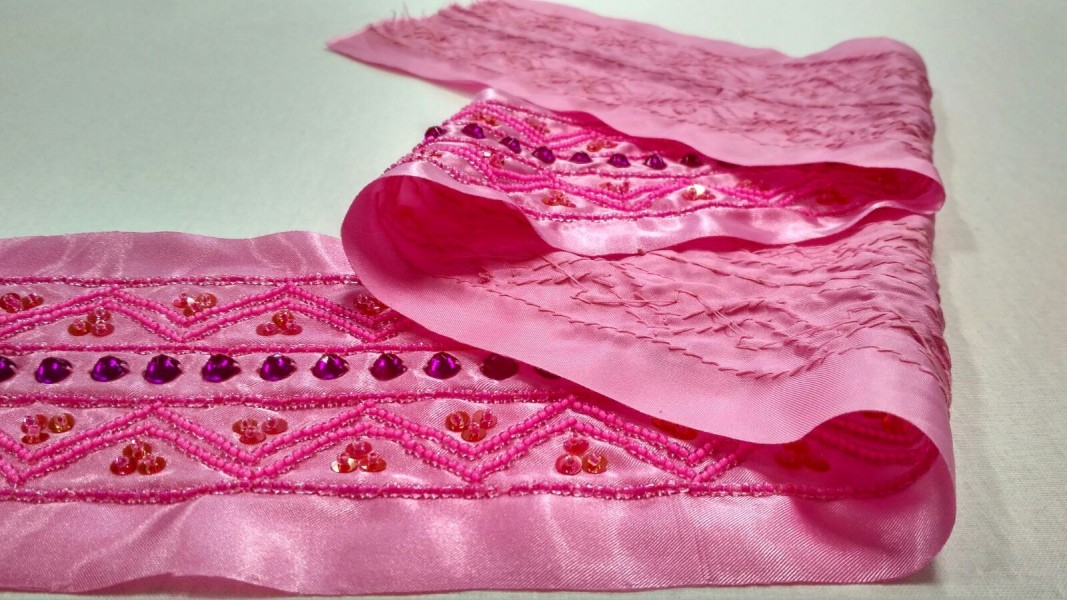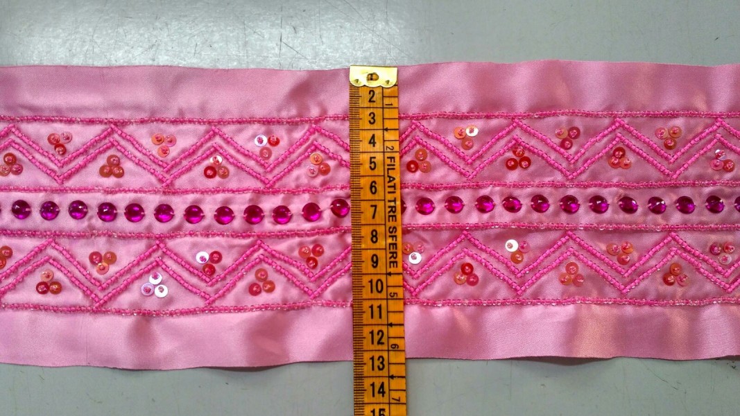 Questa balza in è realizzata in raso ed impreziosita con strass, paillettes e piccole perline colorate sui toni del rosa.