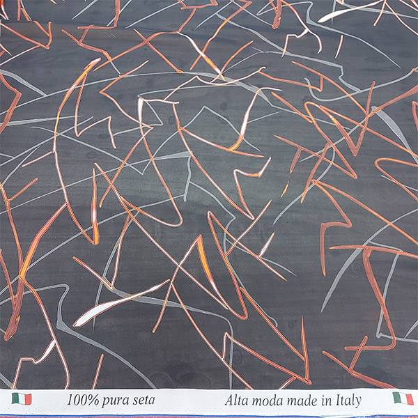 È una seta su base di colore nero con decorazione astratta in tre tenui colori: rosso, grigio e bianco.