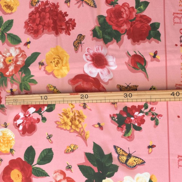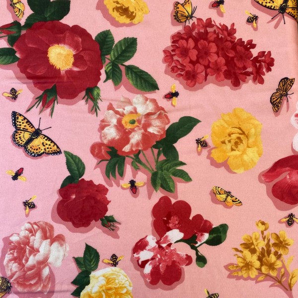 La splendida fantasia di questo tessuto con fiori, api, farfalle e loghi Blumarine multicolor su sfondo rosa corallo crea un esplosione di colori ideale per la stagione primavera estate.