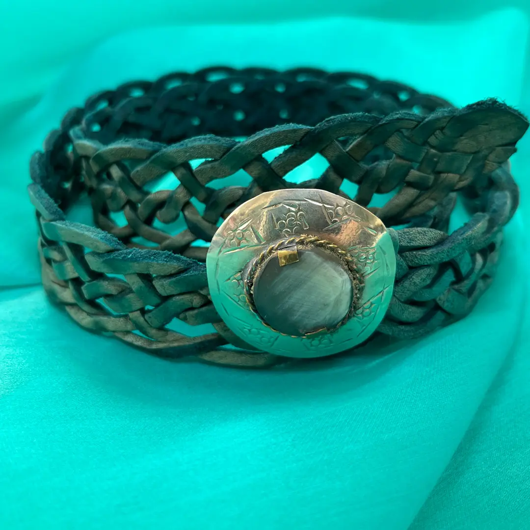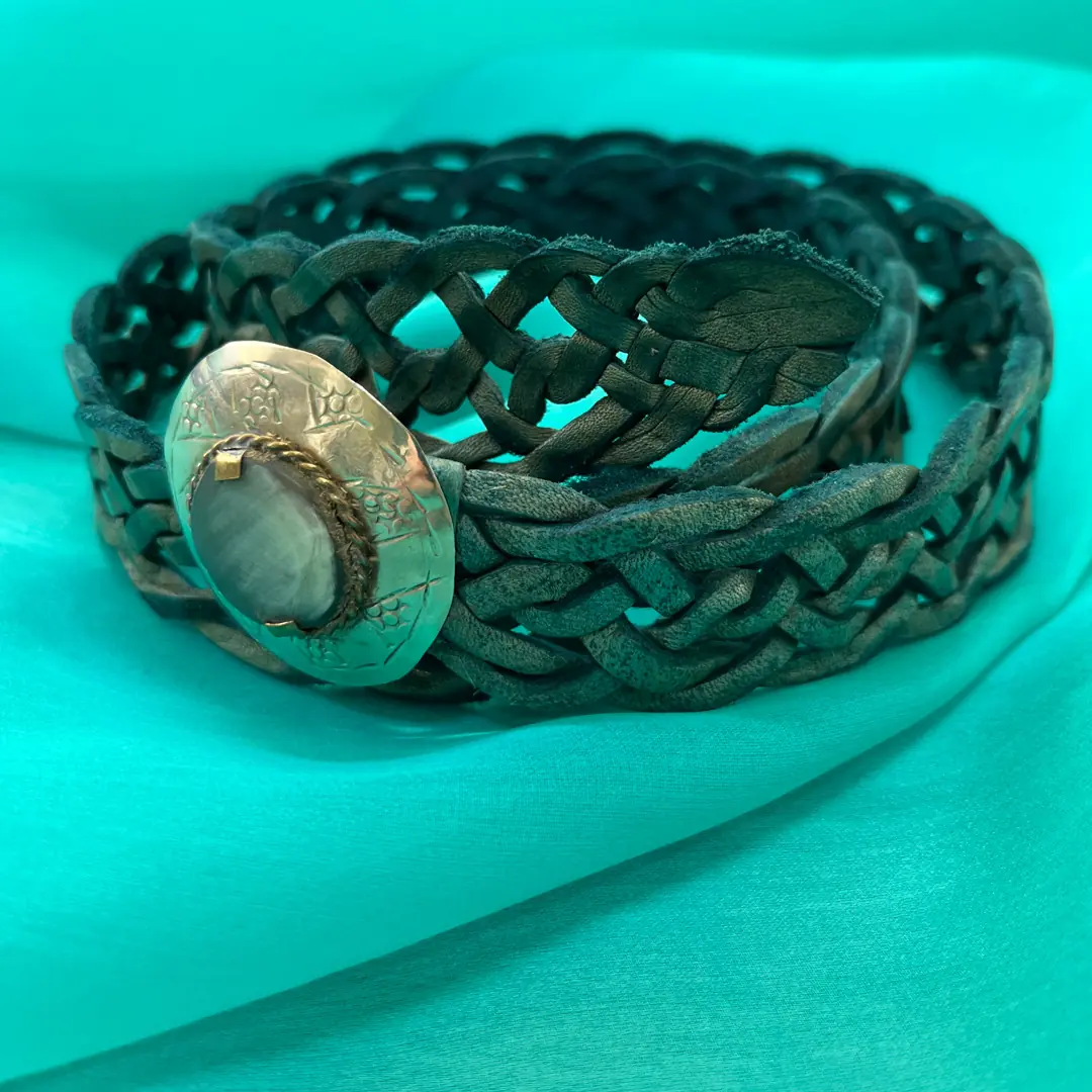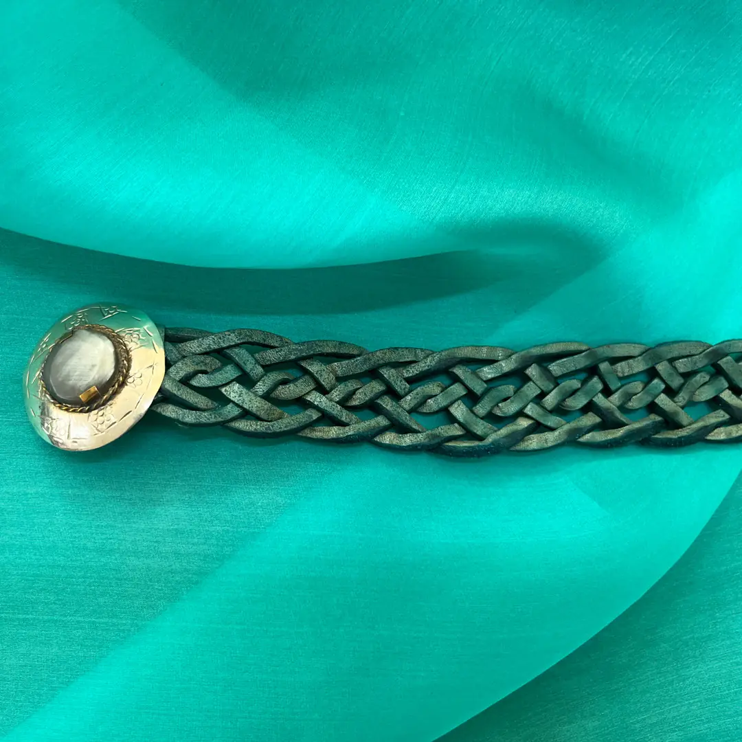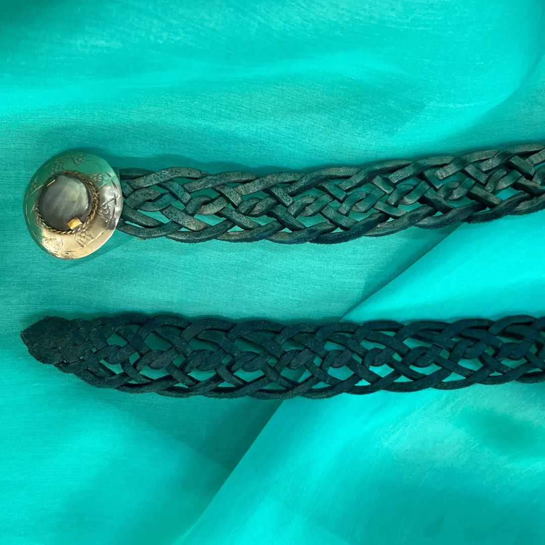 Elegante cintura artigianale caratterizzata da un sofisticato intreccio basketweave che crea una texture tridimensionale ricca e dinamica.