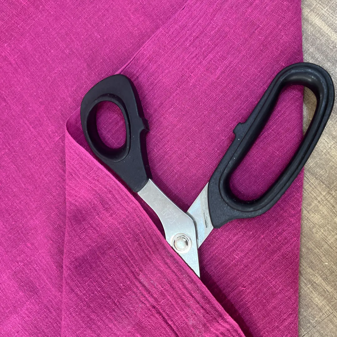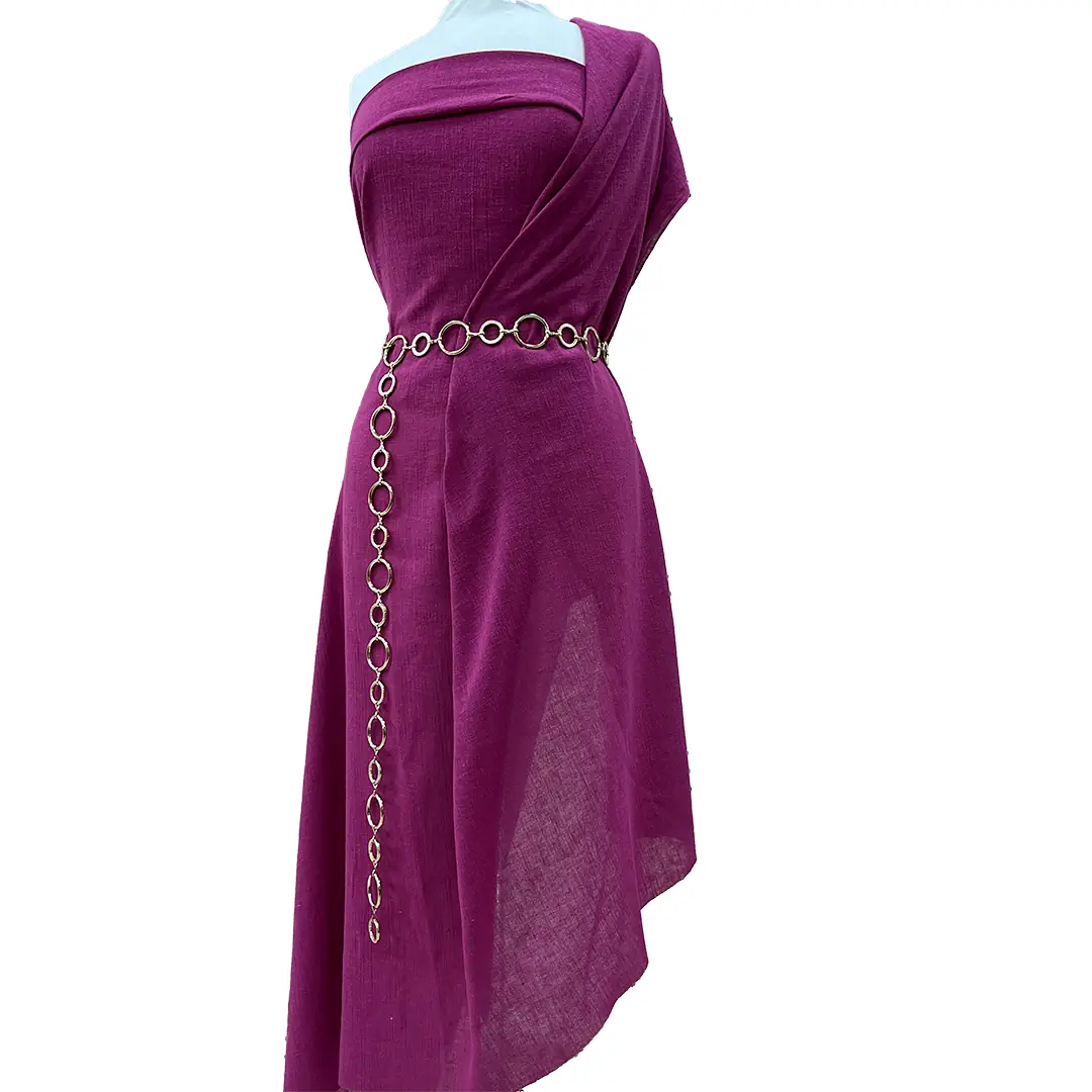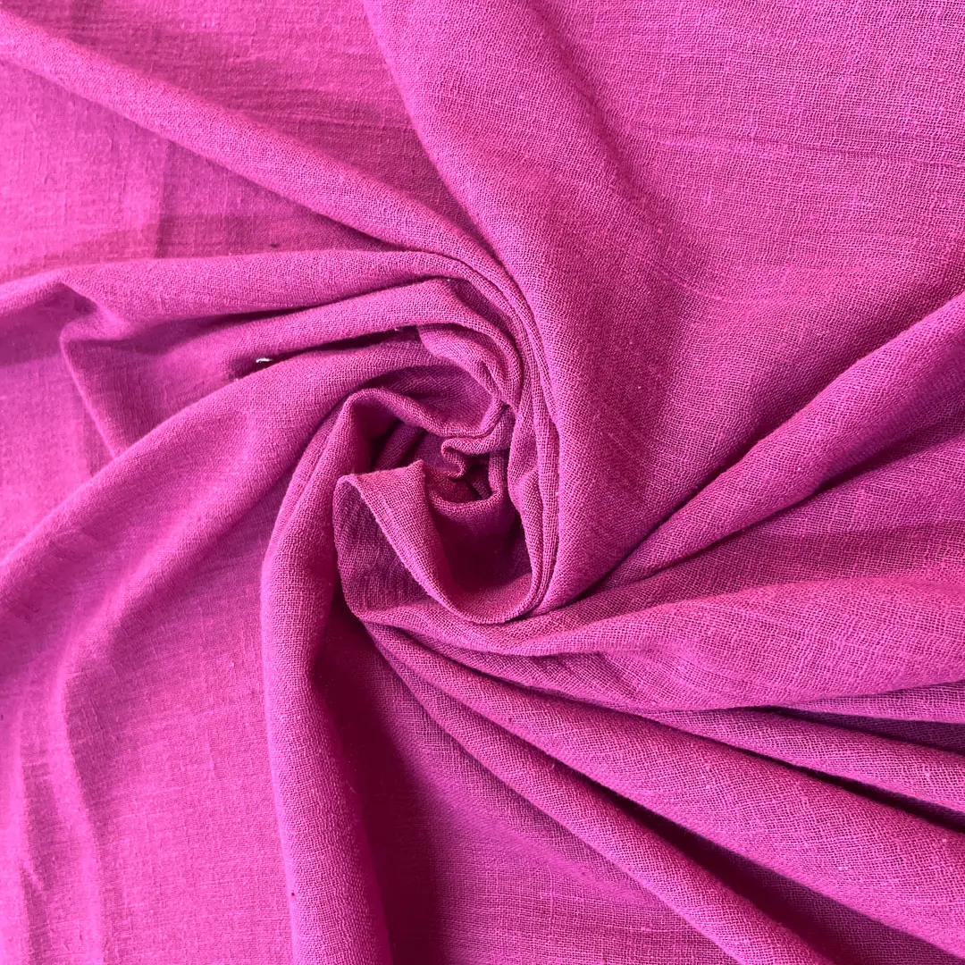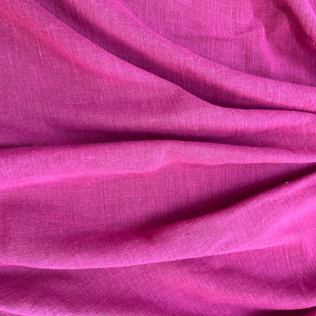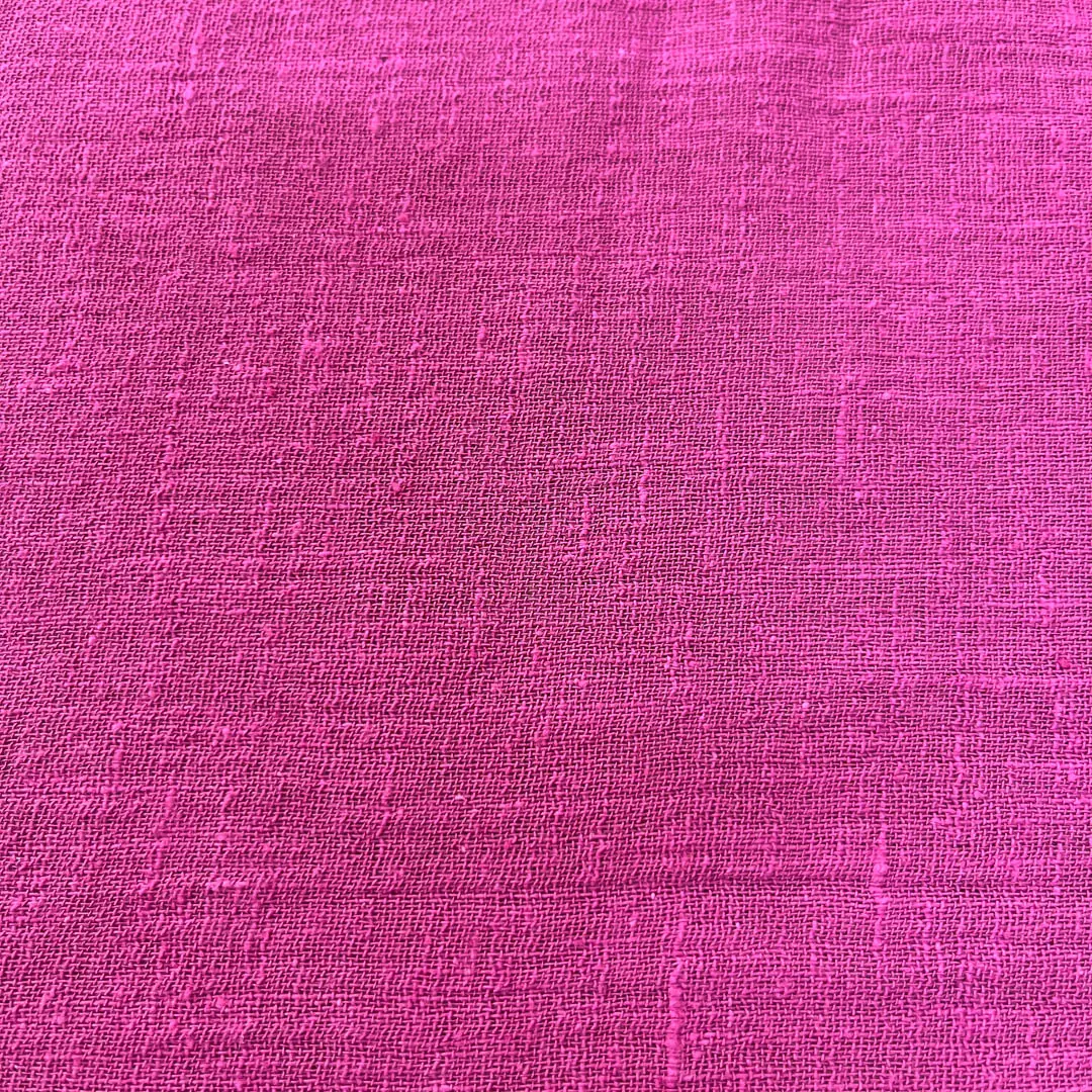La superficie presenta una texture leggermente irregolare e opaca, tipica delle fibre grezze, che richiama la semplicità sofisticata del lino pur mantenendo la morbidezza e la traspirabilità tipiche del cotone. Il colore ciclamino è intenso e vibrante, una tonalità decisa tra il fucsia e il magenta, perfetta per dare carattere e personalità a capi e accessori rimanendo in linea con le tendenze di questa primavera/estate.
