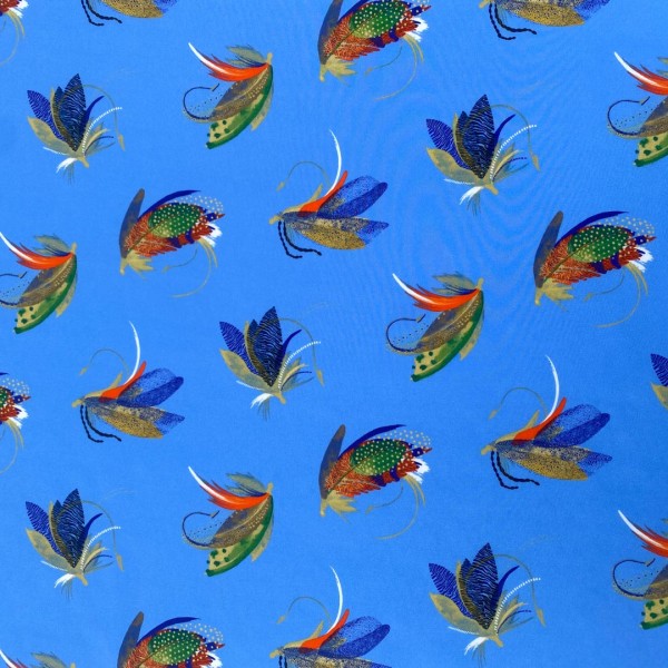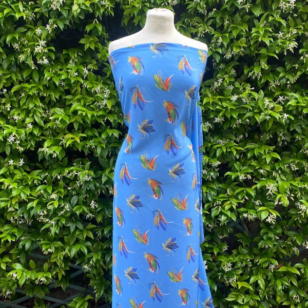 Le piume, in tonalità di arancione, verde, blu e giallo, creano un contrasto vibrante con il fondo azzurro, esaltando la tridimensionalità del disegno e la qualità del tessuto.