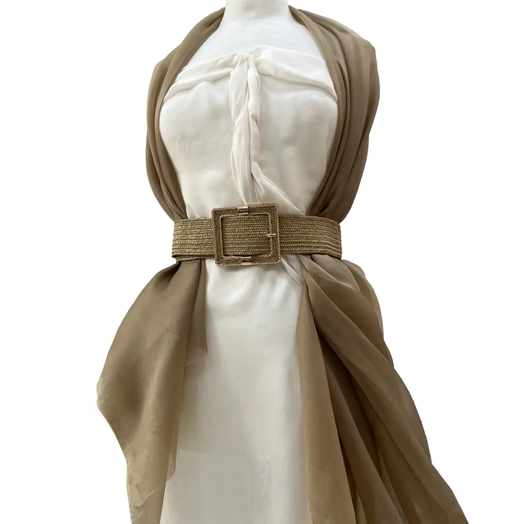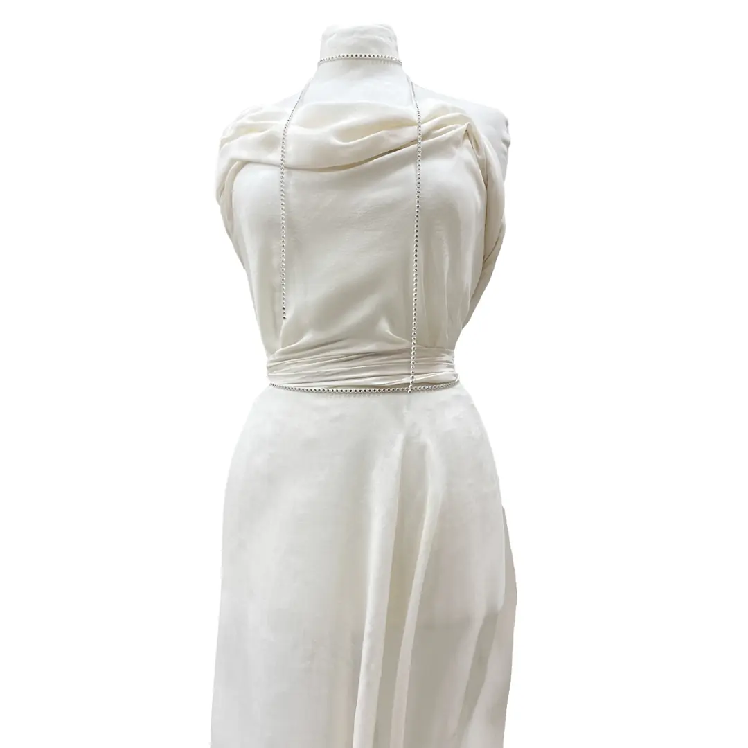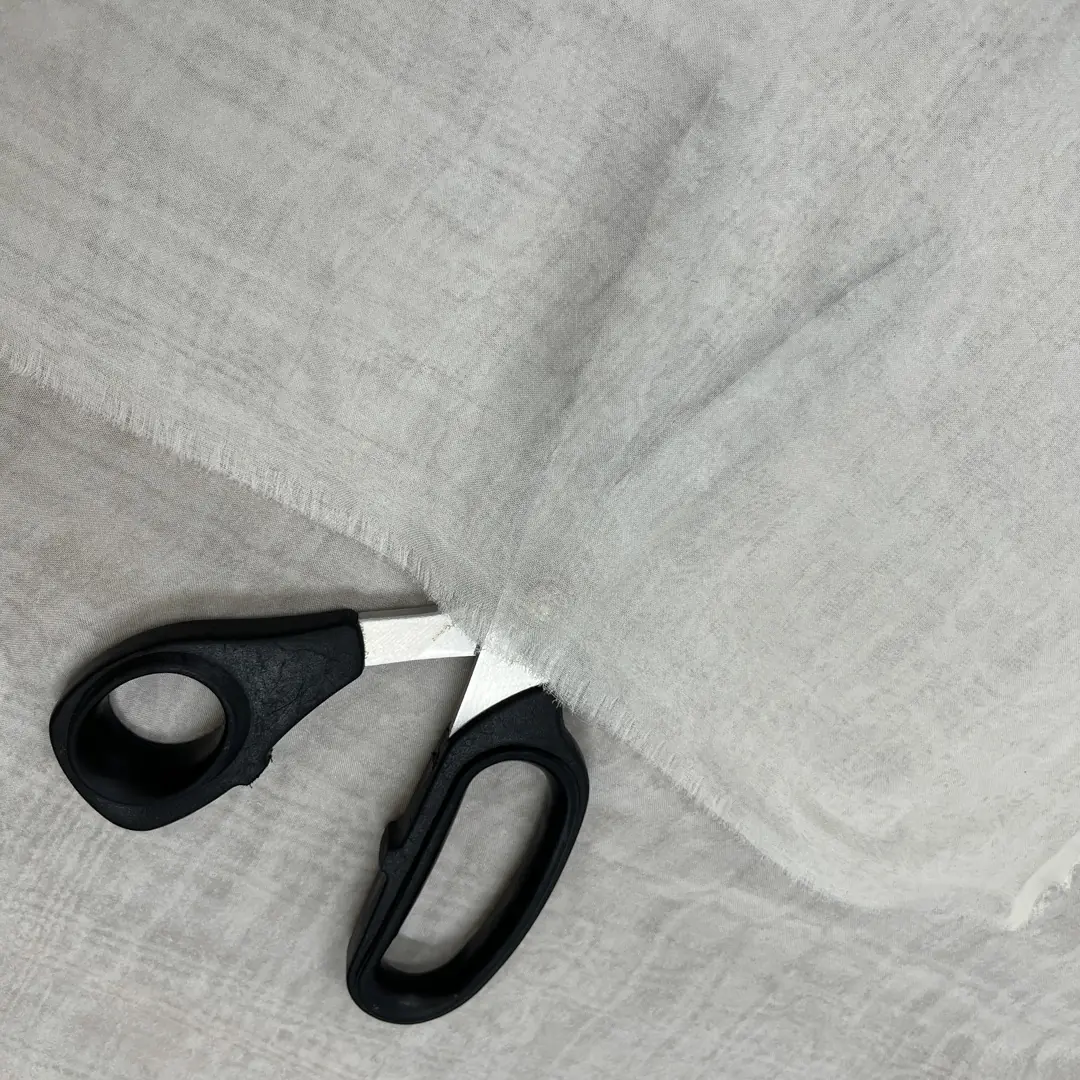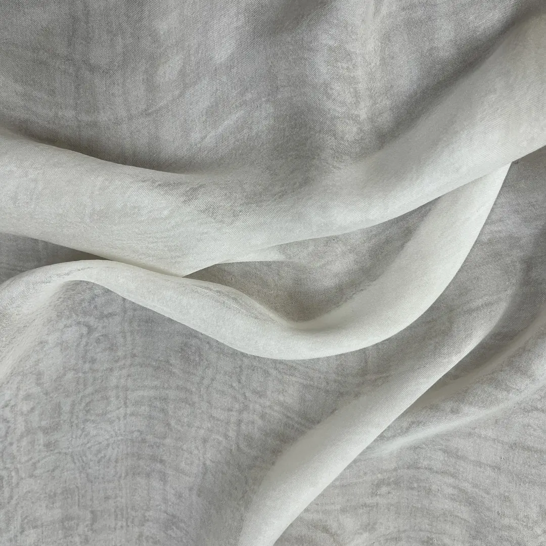 Elegante tessuto in doppia mussola di seta dal colore bianco naturale, noto per la sua leggerezza e trasparenza delicata.