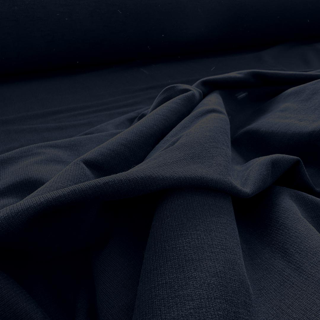 Felpa morbida al tatto, come una carezza sulla pelle. Tessuto adatto per capi di abbigliamento caldi e comodi, si può usare anche per la realizzazione di accessori. Dal colore blu navy, questa felpa trasmette calore. La sua particolarità è quella di essere bielastica.