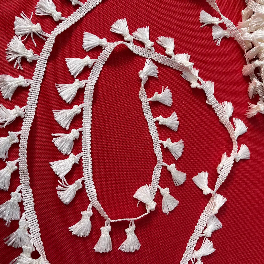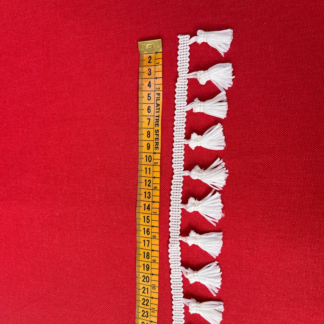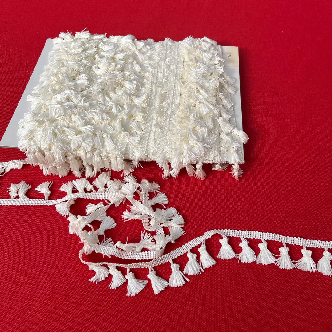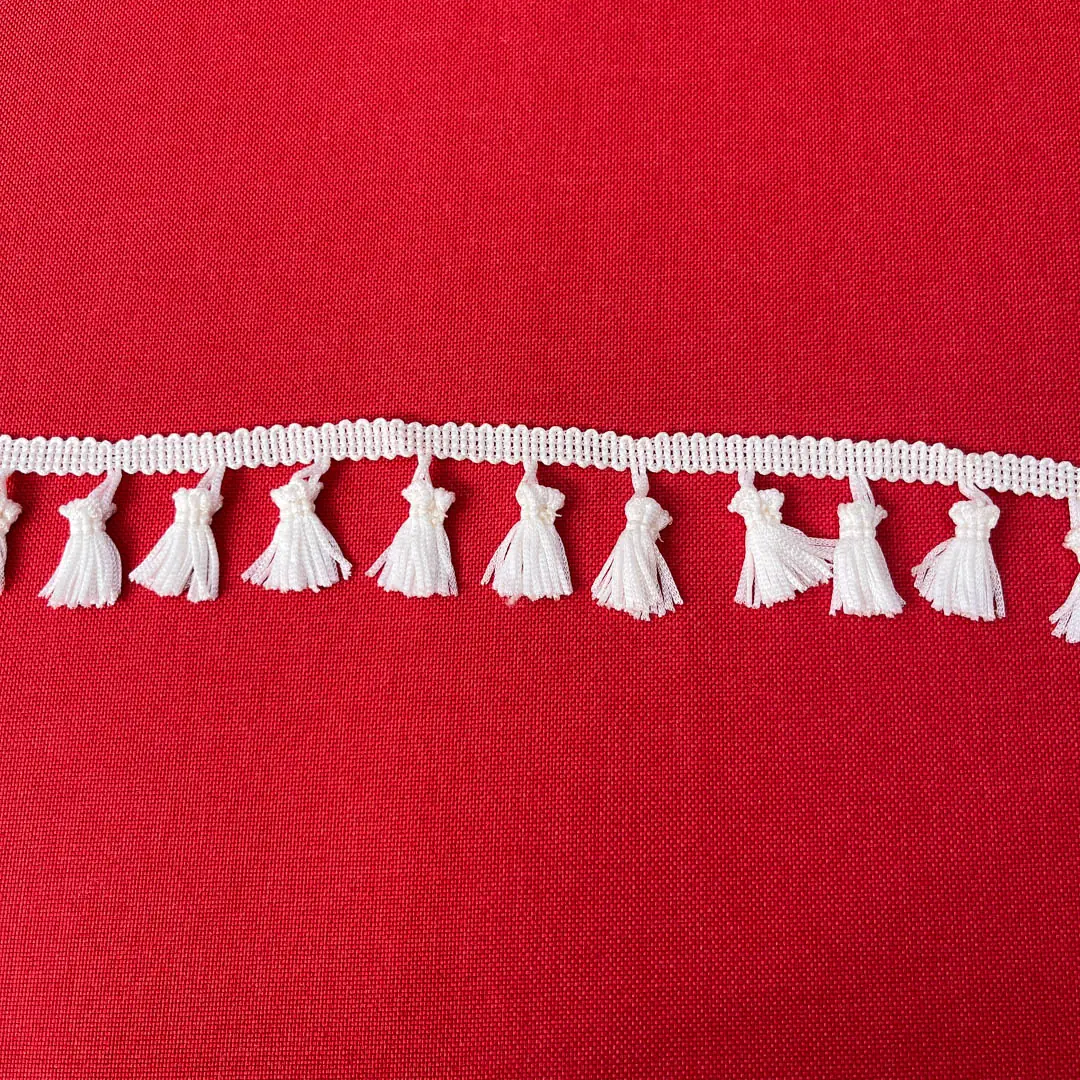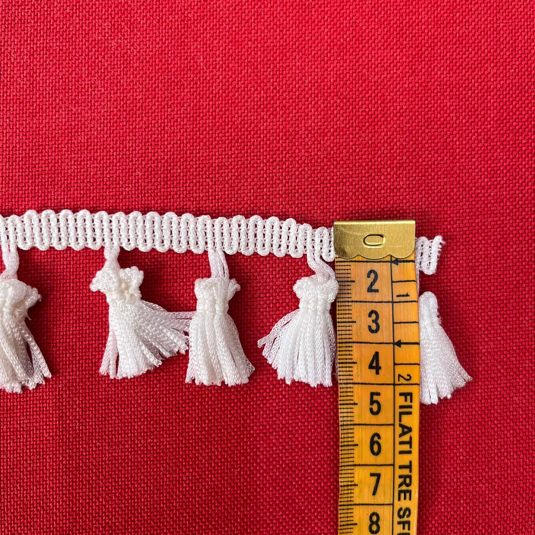 La frangia di colore bianco naturale realizzata in poliestere e costituita da numerosi fili disposti in piccoli ciuffi che pendono uniformemente da una base intrecciata.
