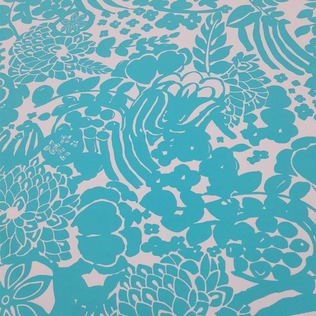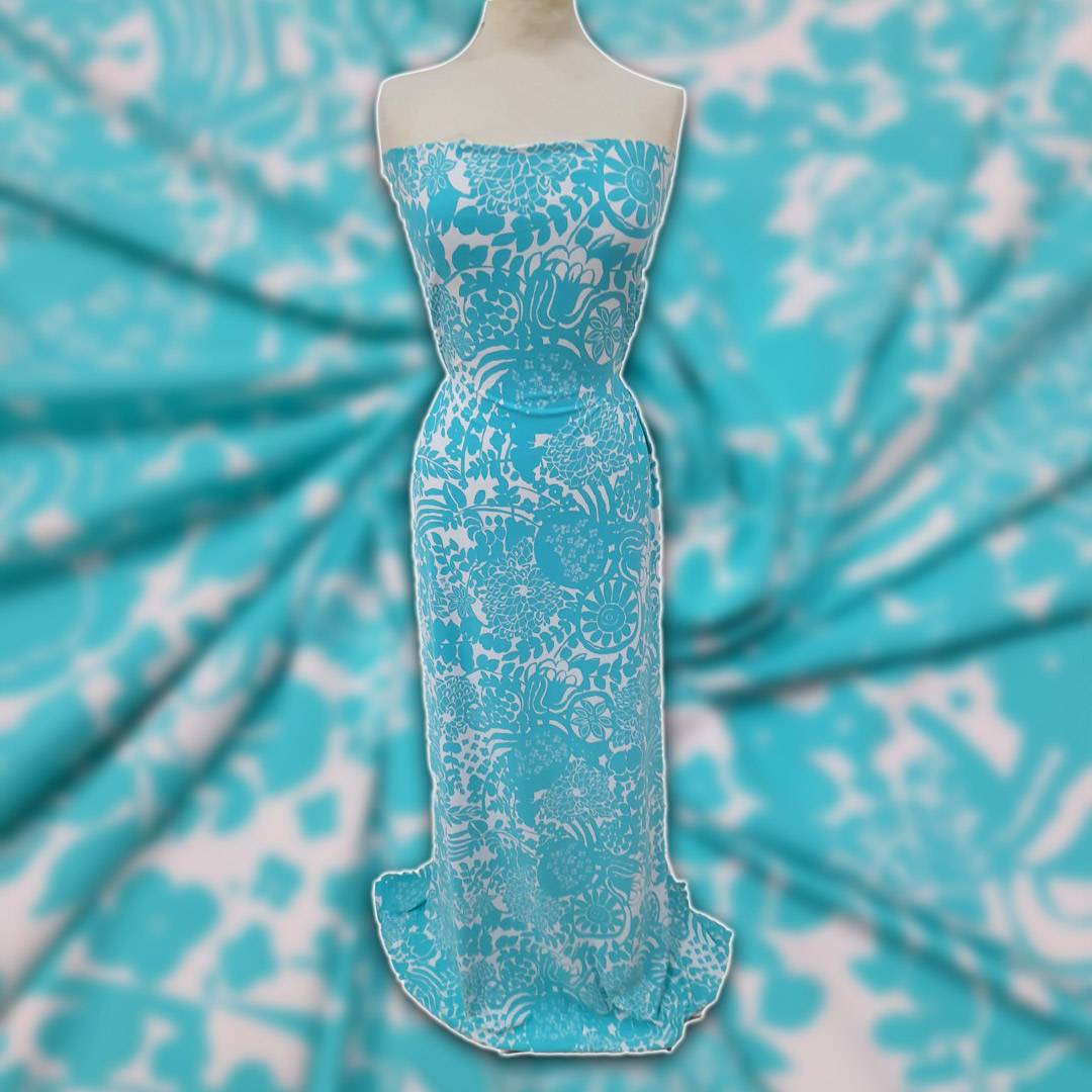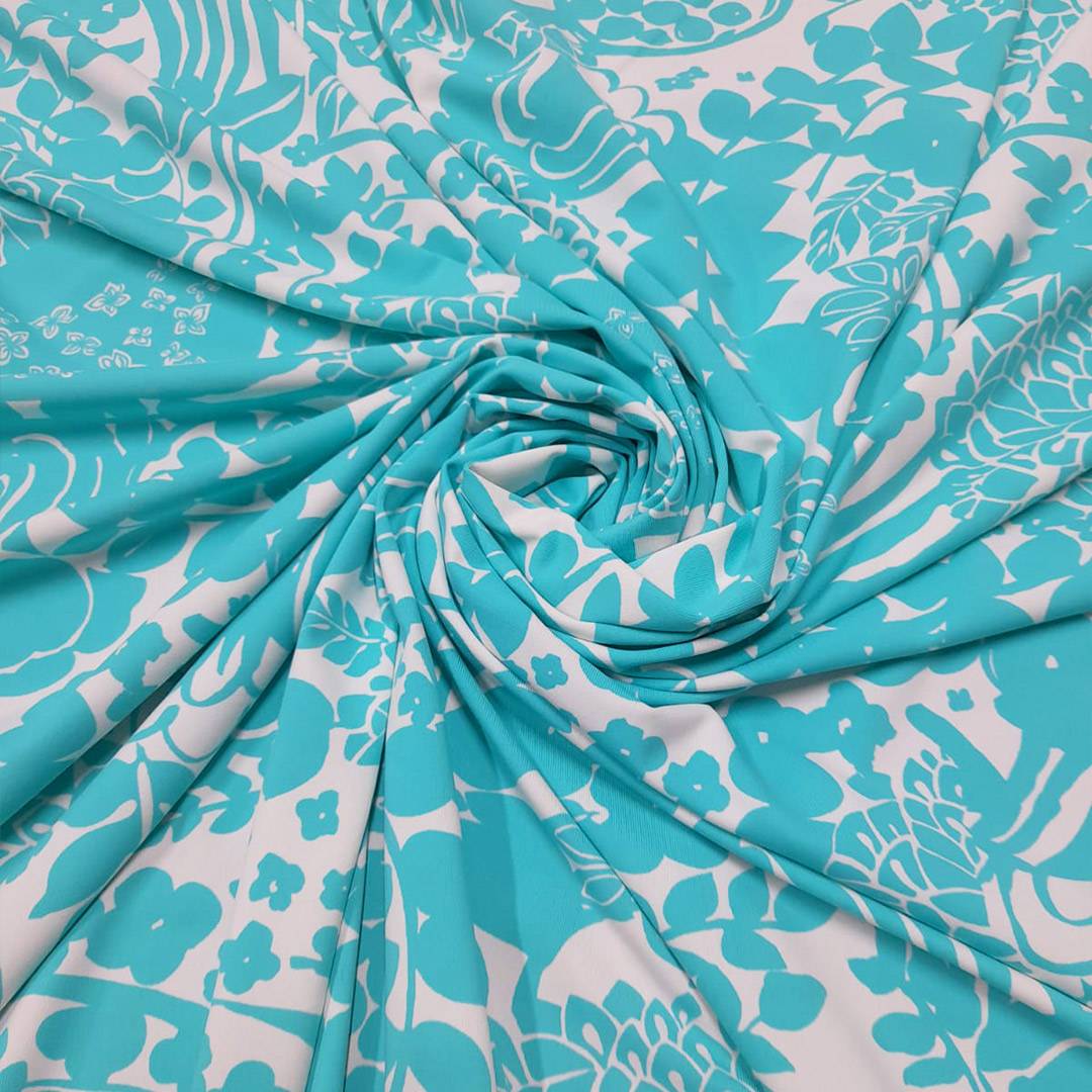 Morbida maglia con base di colore bianco e disegni floreali color verde acquamarina, adatto per qualsiasi capo d’abbigliamento e costumi da bagno.