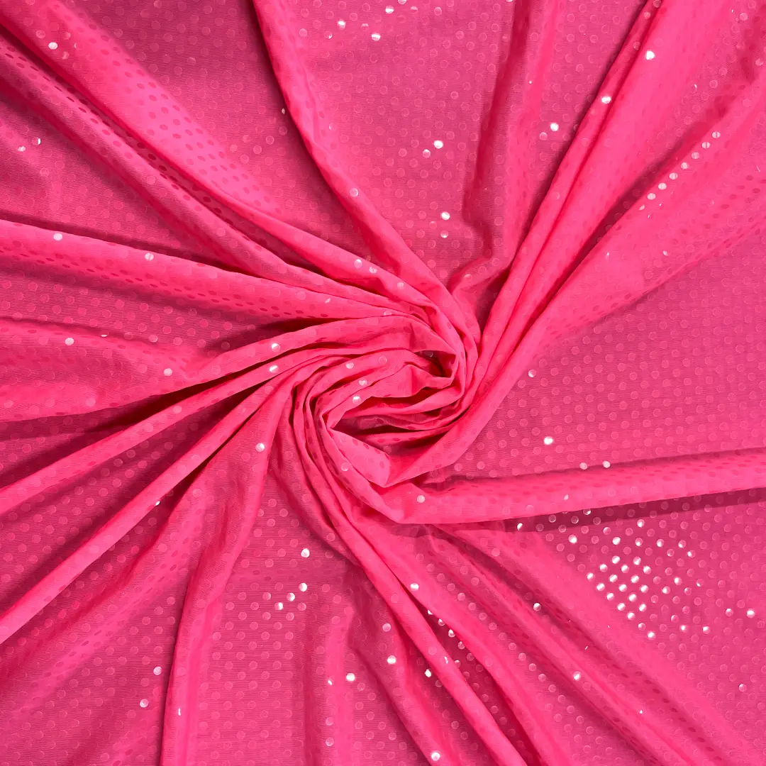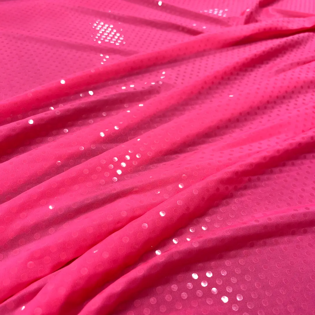 Tessuto bielastico dalla vivace tonalità rosa fluo, impreziosito da una superficie ricoperta di punti luce trasparenti effetto vetro, disposti in una griglia regolare a pois. Il materiale si presenta leggero, elastico e luminoso, con una texture liscia e una lucentezza diffusa che varia con l’inclinazione della luce.
