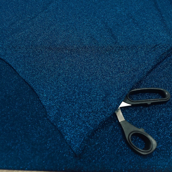 Splendida maglina bielastica con base blu scuro e glitter azzurri.