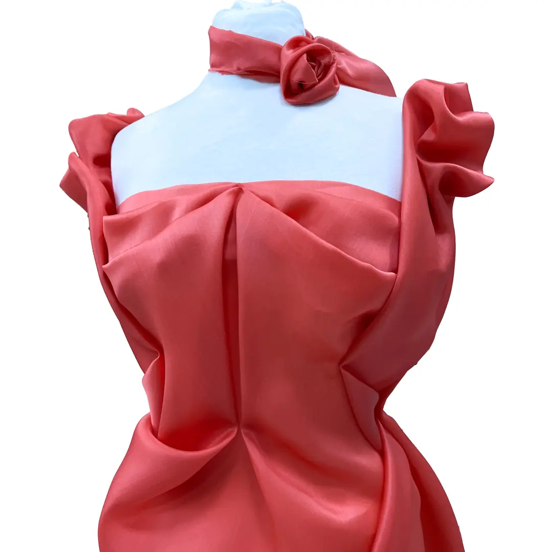 Organza di seta pesante rosa-arancio salmone che si distingue come uno dei tessuti più preziosi nell’ambito della sartoria di alto livello.