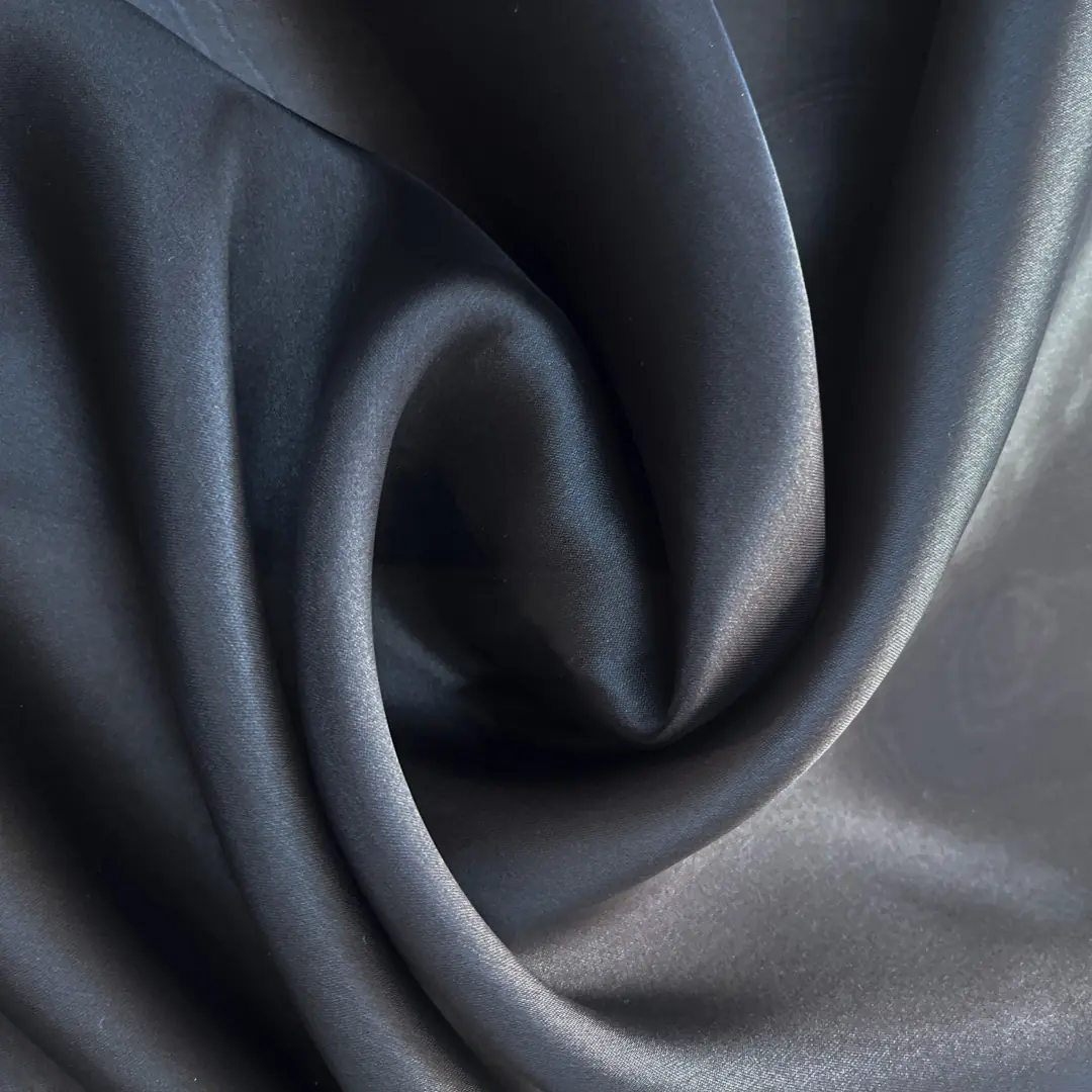 La superficie, setosamente opaca e vibrante, riflette la luce con delicata discrezione, esaltando ogni piega o drappeggio e donando profondità al colore nero, mai banale o piatto.