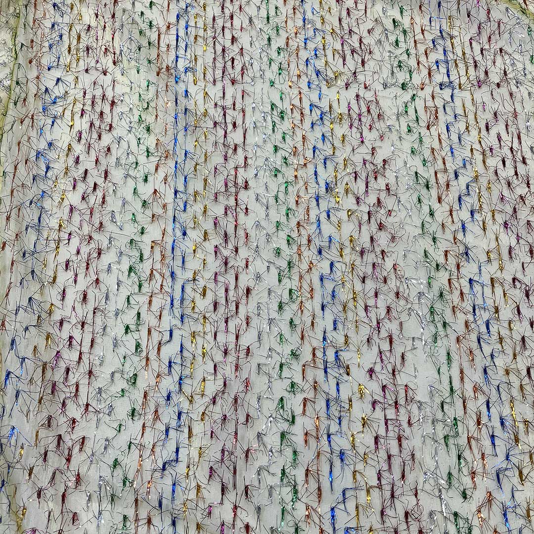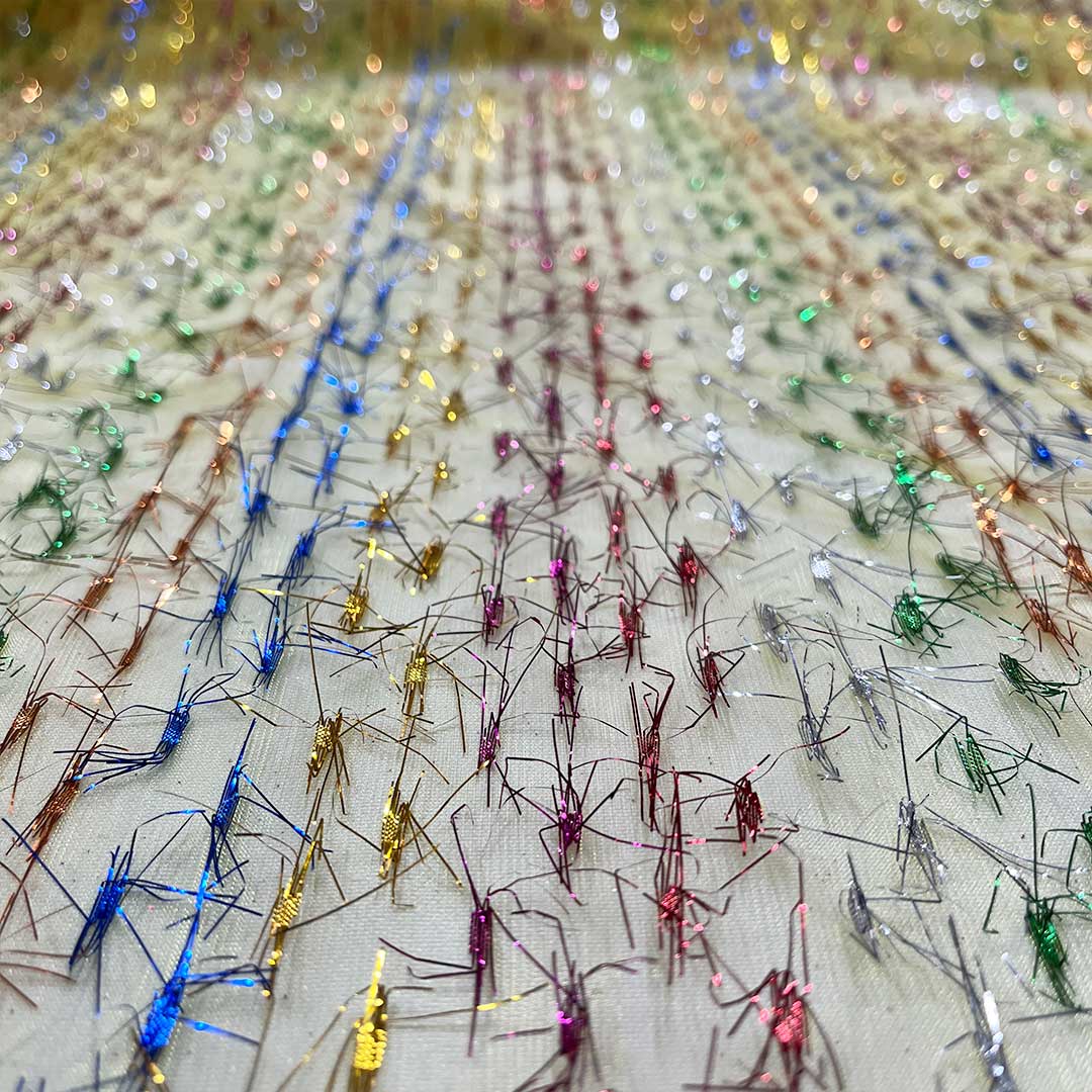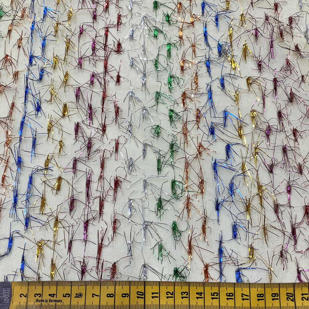 Il colore giallo delicato di questo tessuto aggiunge un tocco di allegria e vivacità, mentre i batuffoli di fili luminosi multicolori creano un effetto magico e giocoso, che cattura l’attenzione e crea un’atmosfera festosa.