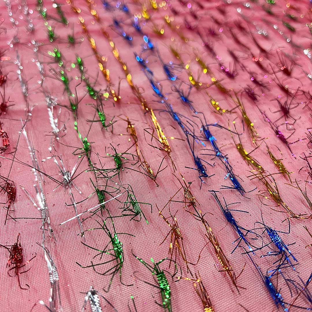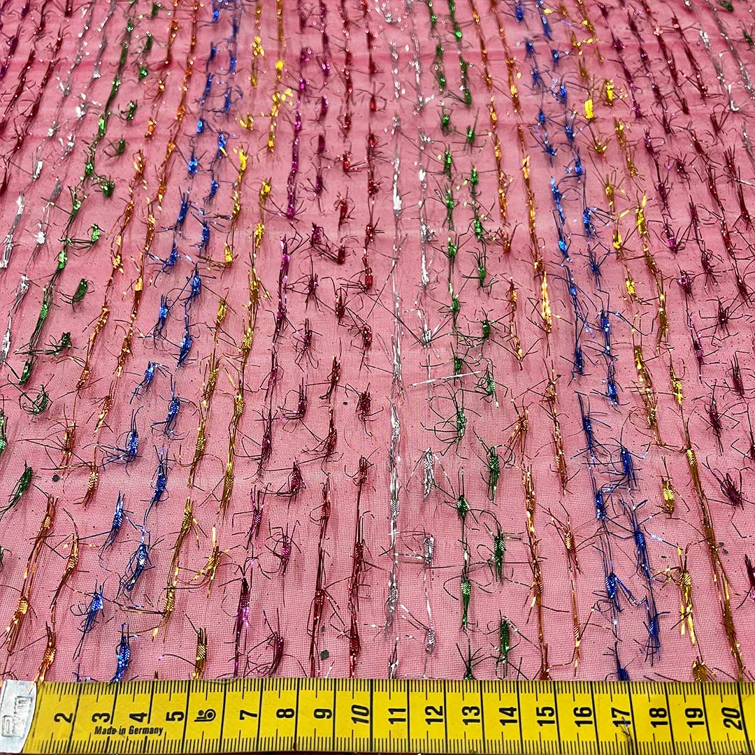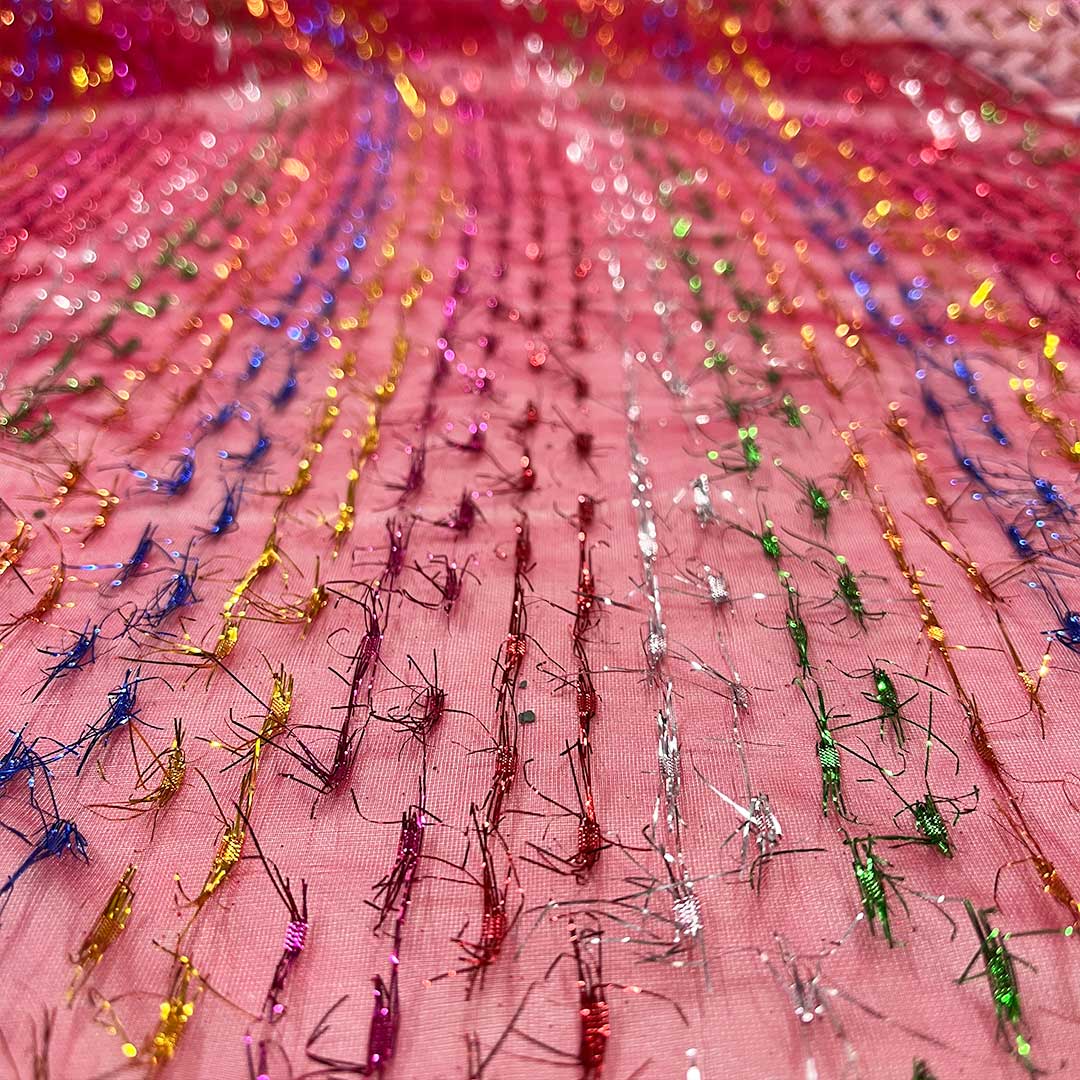 Il rosso lampone di questo tessuto aggiunge una nota di vitalità e passione, mentre i batuffoli di fili luminosi multicolori creano un effetto magico e giocoso, che cattura l’attenzione e crea un’atmosfera festosa.