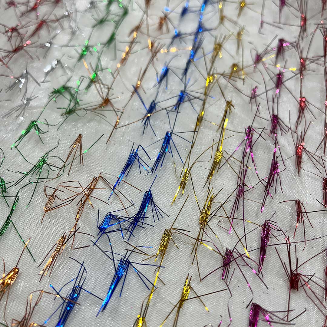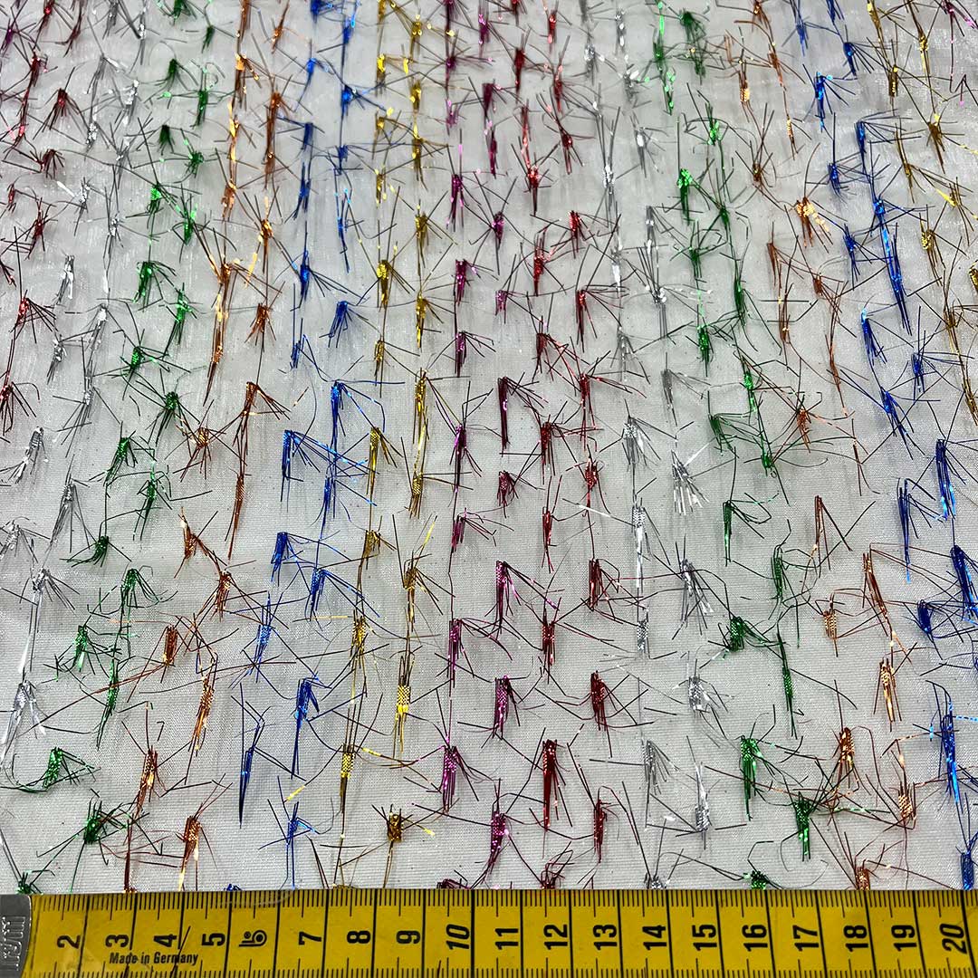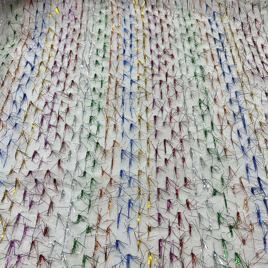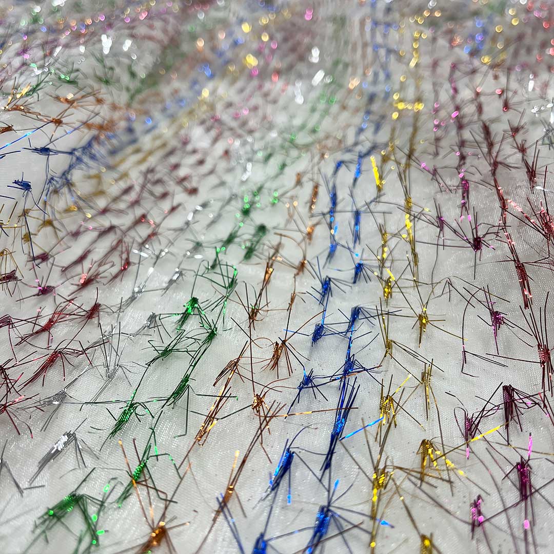 I batuffoli di fili luminosi multicolori di questo tessuto creano un effetto magico e giocoso, che cattura l’attenzione e crea un’atmosfera festosa.