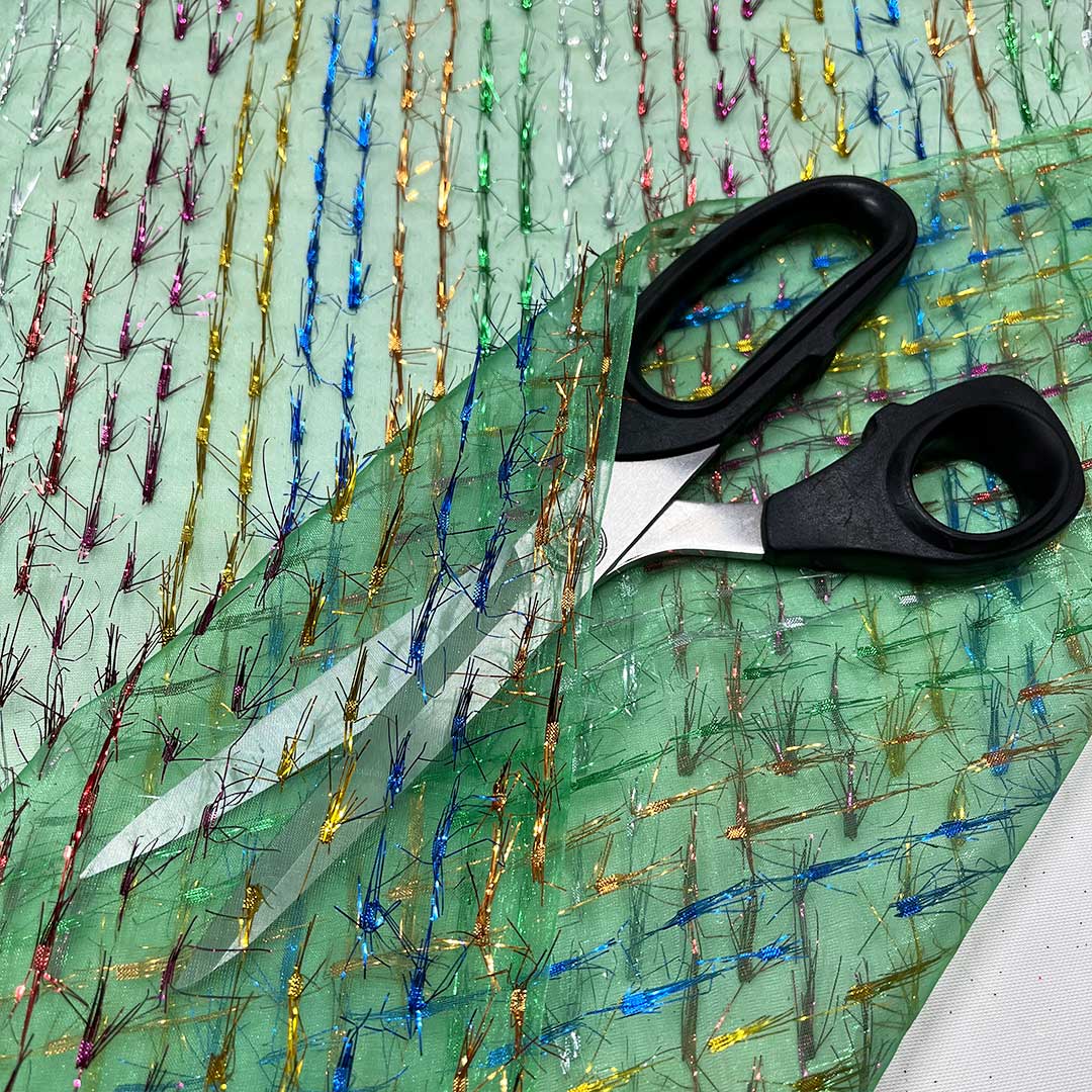 Tessuto trasparente in organza verde con fili luminosi multicolor