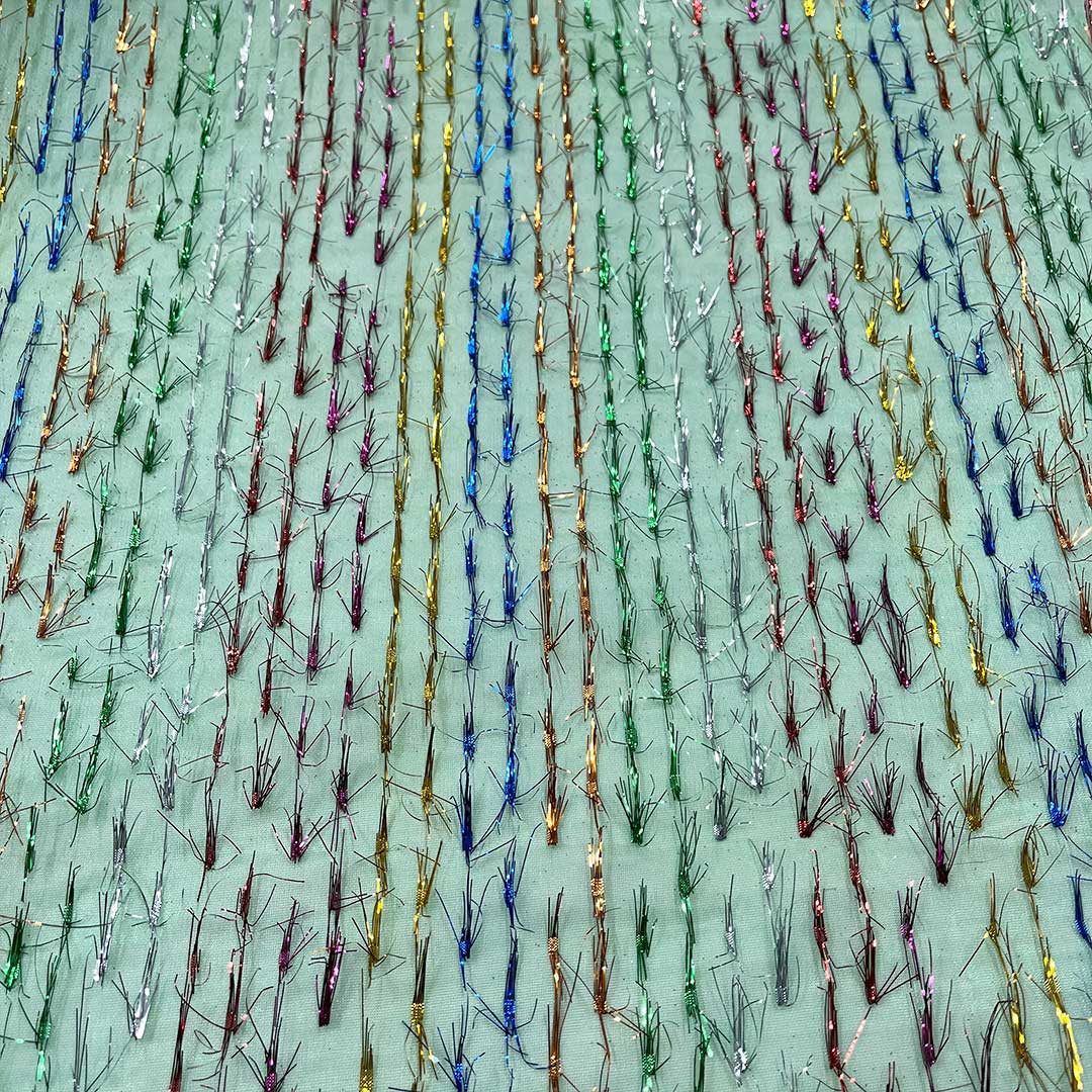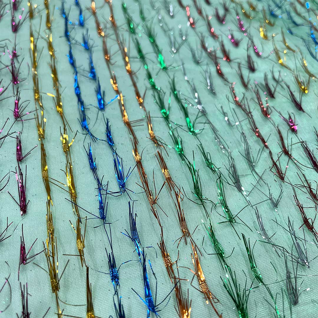 Il verde brillante di questo tessuto aggiunge una nota di freschezza e vitalità, mentre i batuffoli di fili luminosi multicolori creano un effetto magico e giocoso, che cattura l’attenzione e crea un’atmosfera festosa.