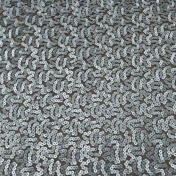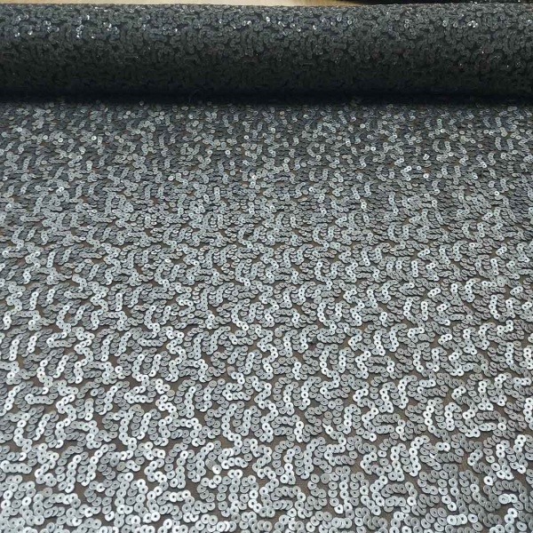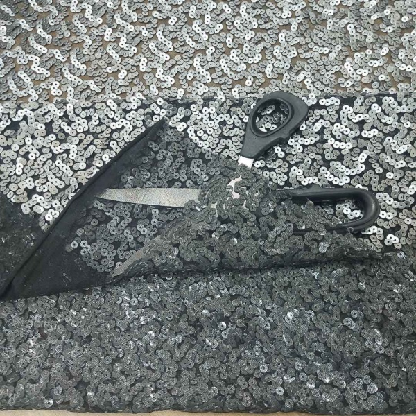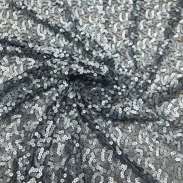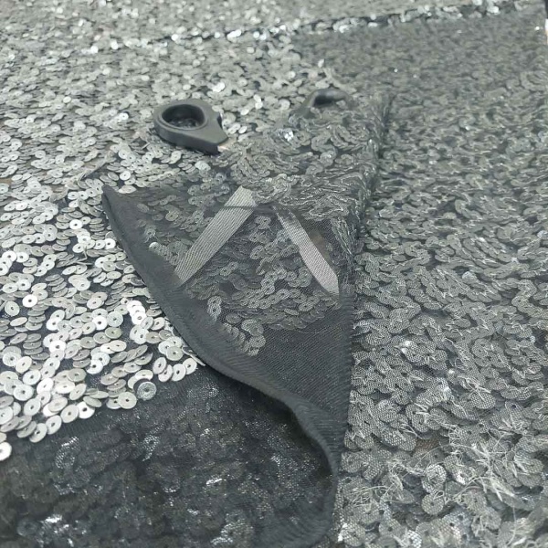 Il contrasto tra il nero della base e il grigio delle paillettes contribuisce a un equilibrio estetico sofisticato, adatto a creazioni di alta moda, abiti da sera, costumi per spettacoli o persino accessori particolari.