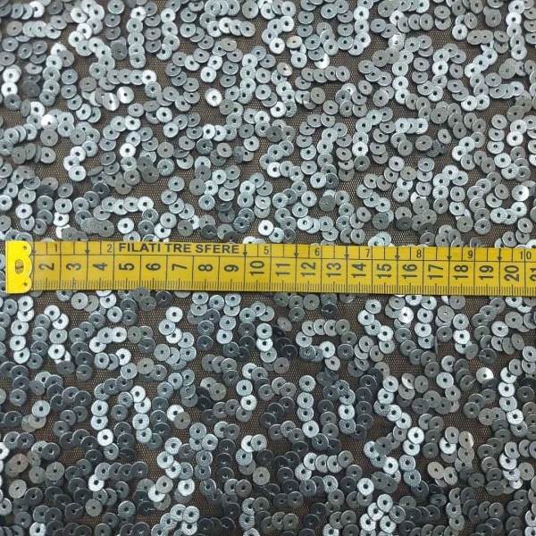 Elegante combinazione di paillettes tonde grigie applicate su una base di tulle nero elasticizzato.