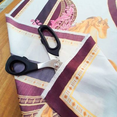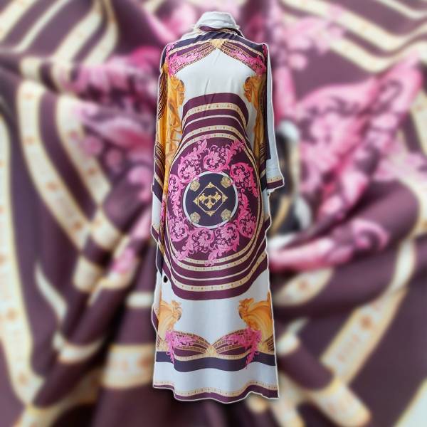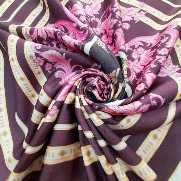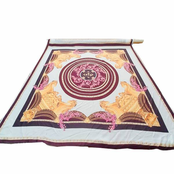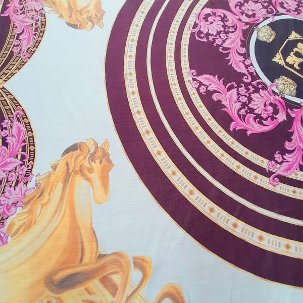 Leggero tessuto in viscosa semicoprente e non elasticizzato, con base di colore bianco “panna” e, nel centro, stampa a forma circolare con disegni astratti, di vari colori dai toni caldi come il marrone e il rosa chiaro, incorniciato da figure equestri e disegni astratti nei toni dell’oro, rosa e marrone.