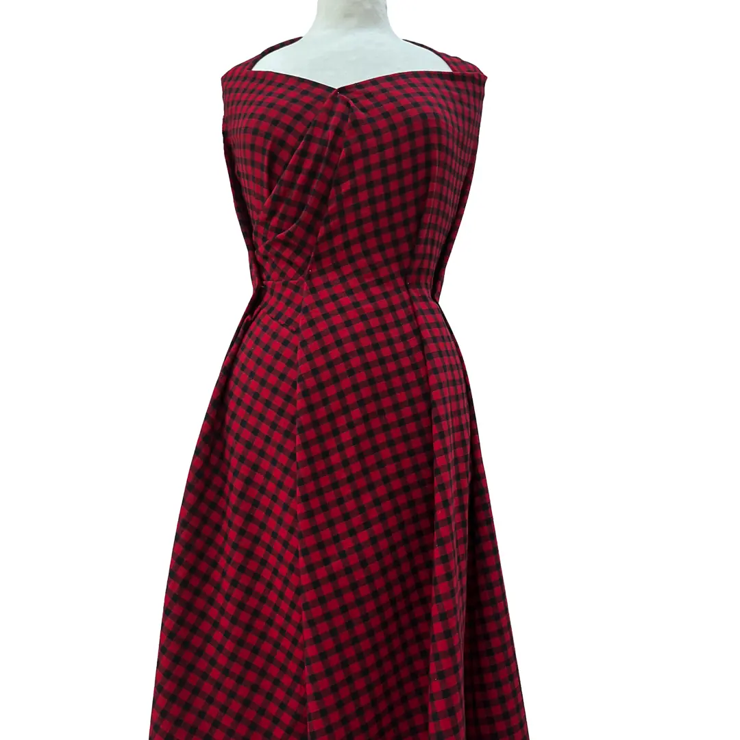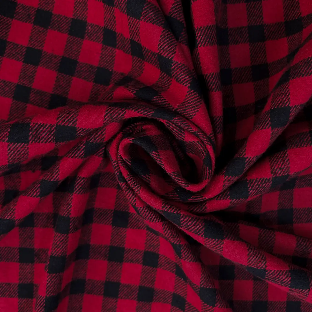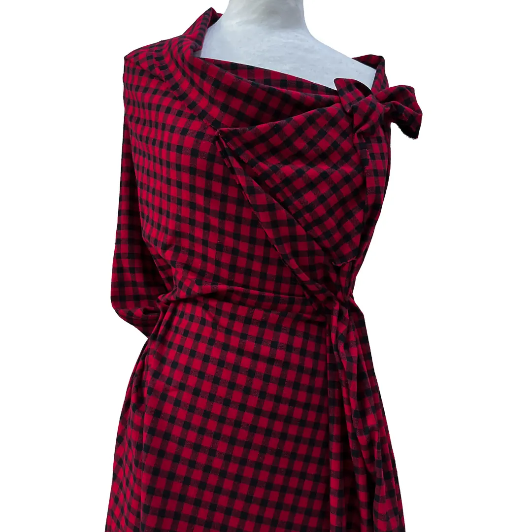 Panno quadrettato di alta qualità composto al 100% da pura lana, con una trama classica a quadri che alterna strisce regolari di rosso intenso e nero profondo, creando un pattern equilibrato e geometrico ideale per applicazioni sartoriali versatili.