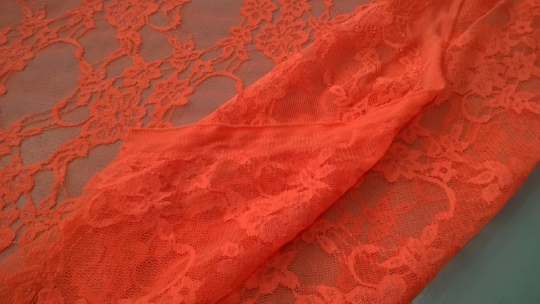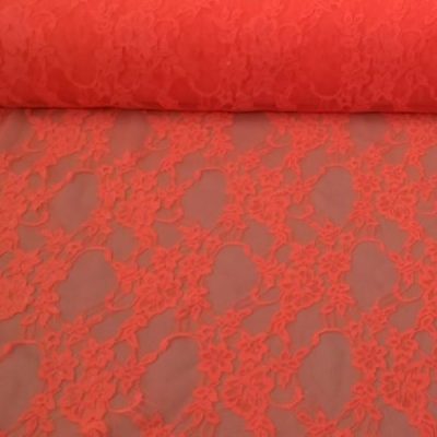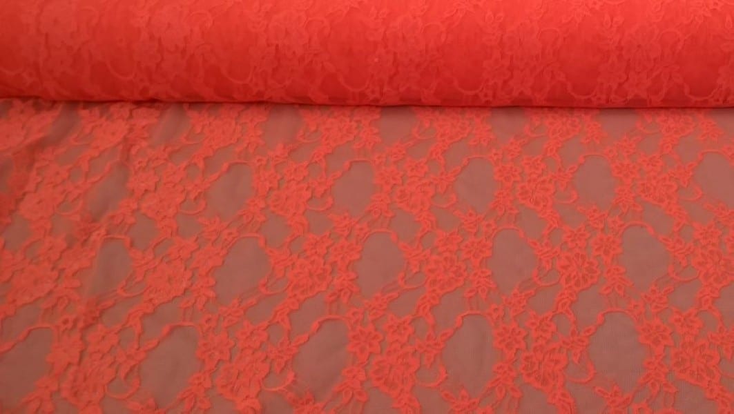 Tessuto in pizzo a rete con in rosso-arancio fluo, a fantasia floreale