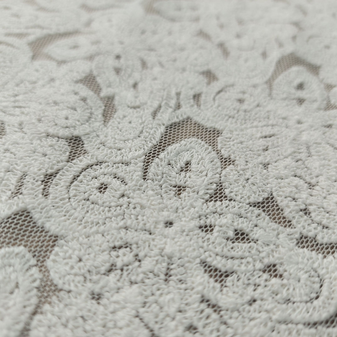 Il bianco naturale del pizzo contribuisce a conferire un senso di purezza e leggerezza al tessuto. La trasparenza del tulle, unita alla complessità e alla tridimensionalità del ricamo, genera un affascinante gioco di luci e ombre che esalta la bellezza del materiale. La sua versatilità lo rende perfetto non solo per abiti da sposa, ma anche per veli, corpini e inserti decorativi su capi raffinati.