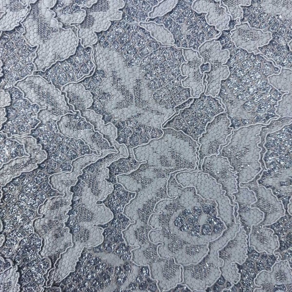 Questo pizzo da abbigliamento grigio su base glitterata è un tessuto raffinato e sofisticato, ideale per creazioni eleganti e di grande impatto visivo.