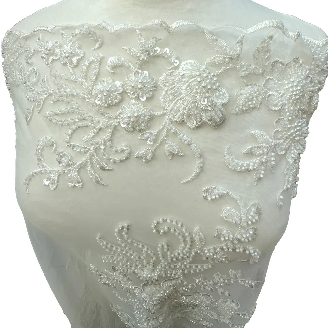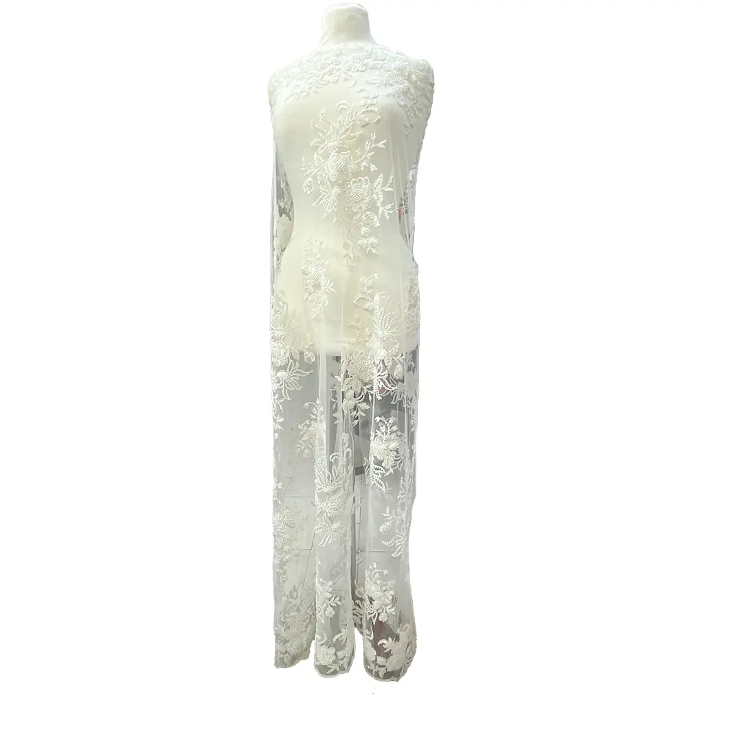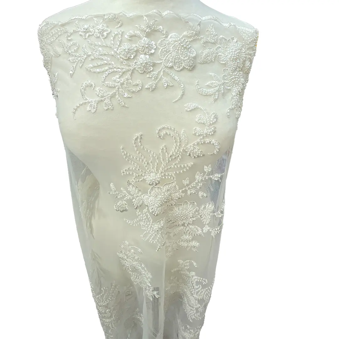 La base del pizzo è costituita da un tulle estremamente leggero e trasparente, che crea una base aerea e delicata per i ricami, ricchi e intricati, che creano motivi floreali o geometrici. Questi ricami sono spesso realizzati con fili di cotone o seta finissimi, che conferiscono al pizzo una texture morbida e raffinata. Per impreziosire ulteriormente il tessuto, sono state aggiunte delle delicate applicazioni di perline. La scelta del bianco naturale conferisce al pizzo un’eleganza classica e senza tempo, rendendolo perfetto per occasioni speciali come matrimoni o eventi formali.