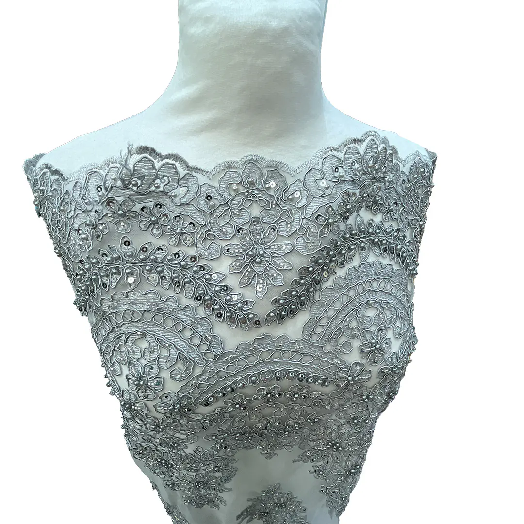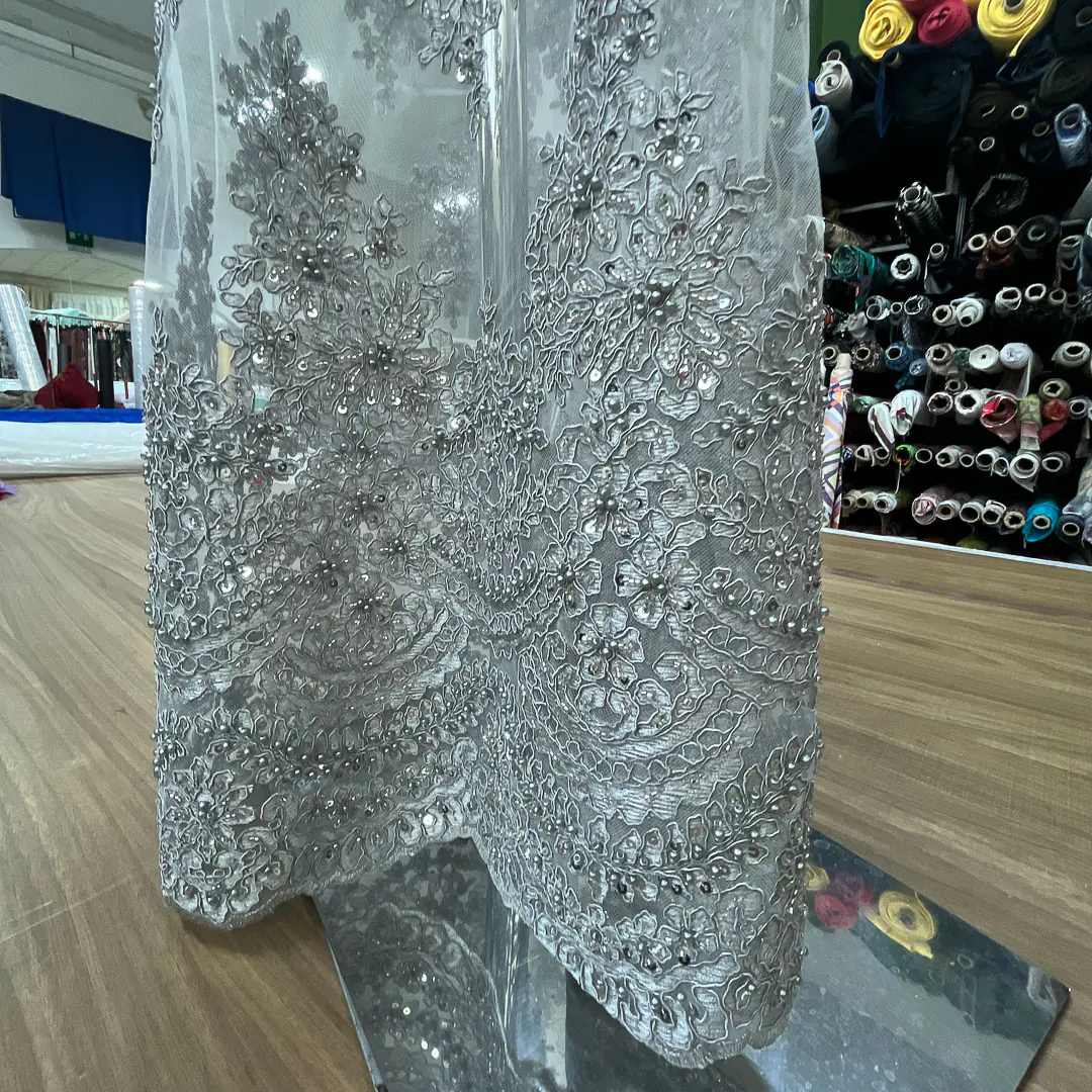 Il ricamo è uno degli aspetti centrali della stoffa. I disegni sono complessi e dettagliati, con motivi floreali che si ripetono. I fili utilizzati per i ricami offrono un contrasto visivo rispetto alla trasparenza del tulle. Questi ricami aggiungono profondità e struttura al tessuto, trasformando una base semplice in una creazione lussuosa. Le perline, applicate manualmente, aggiungono un ulteriore livello di preziosità al tessuto.
