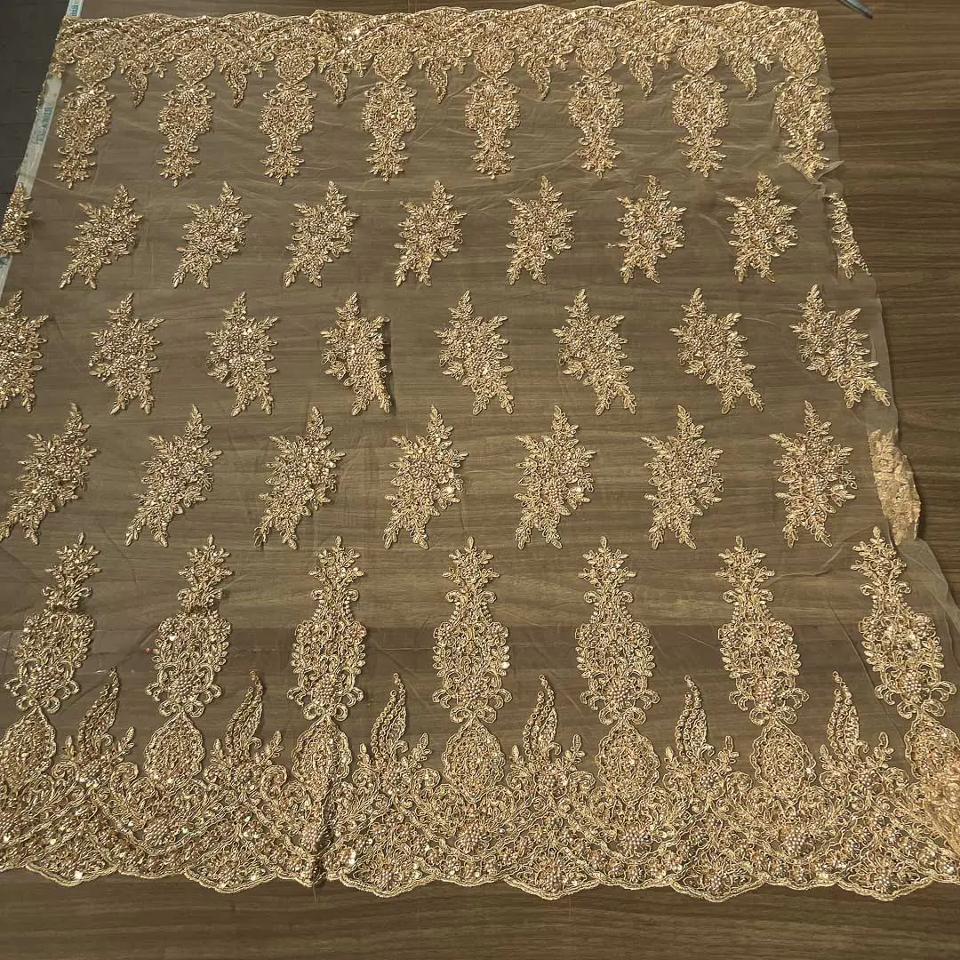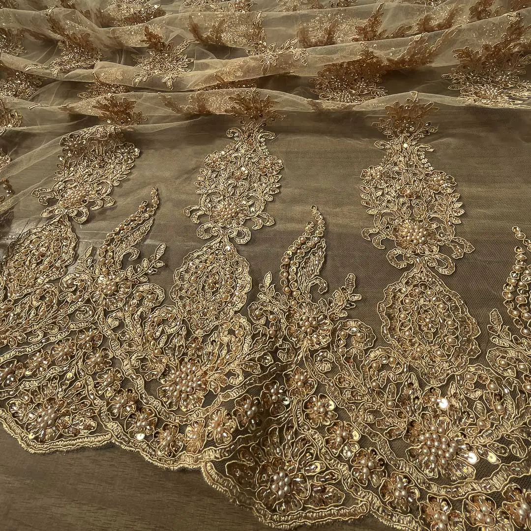 Sul tulle sono applicati preziosi ricami arricchiti con perline, sempre tono su tono, che presentano motivi floreali, creando disegni elaborati.