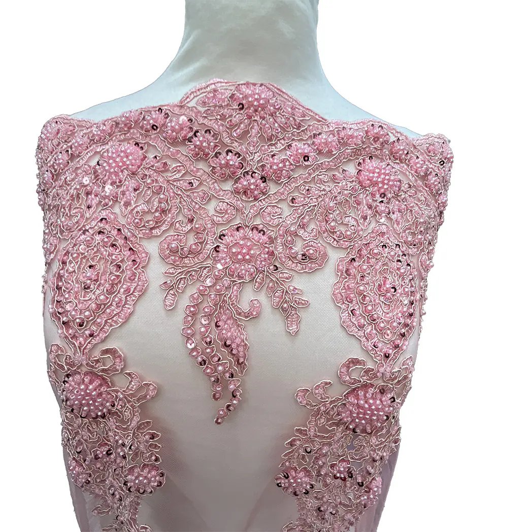 La base in tulle è leggera, trasparente e morbida al tatto, perfetta per conferire un aspetto etereo e fluttuante ai capi d’abbigliamento. Il colore rosa tenue dona al tessuto una sensazione di delicatezza e romanticismo, rendendolo particolarmente adatto per abiti da sposa, cerimonia o alta moda.