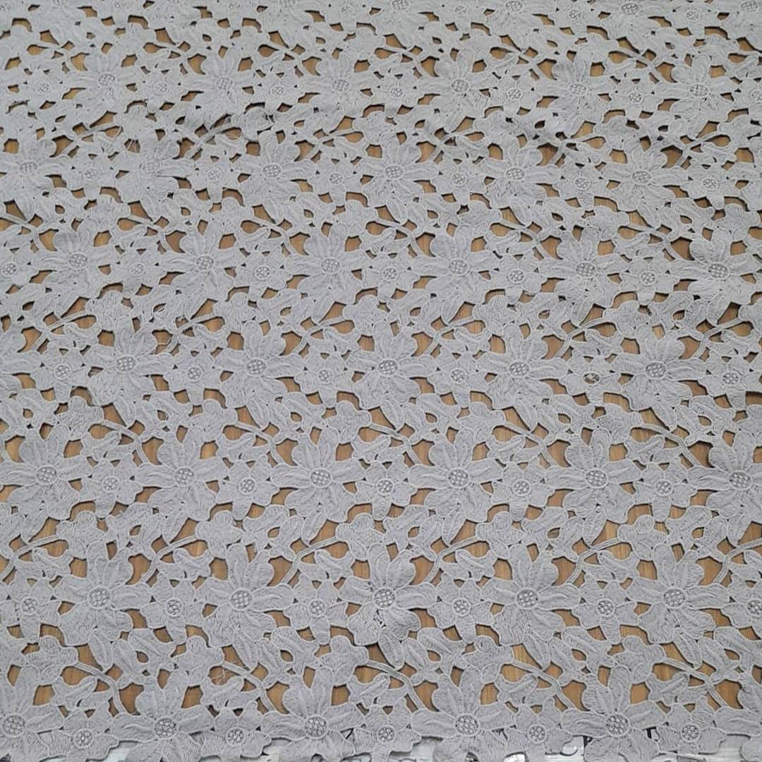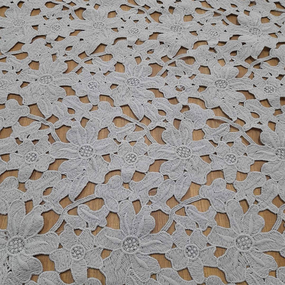 Elegante pizzo di macramè in colore grigio con motivo floreale, ideale per dettagli originali per i vostri capi d’abbigliamento.