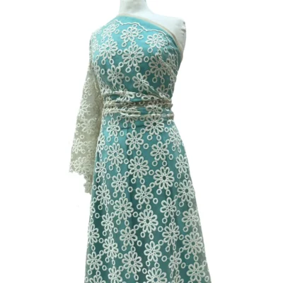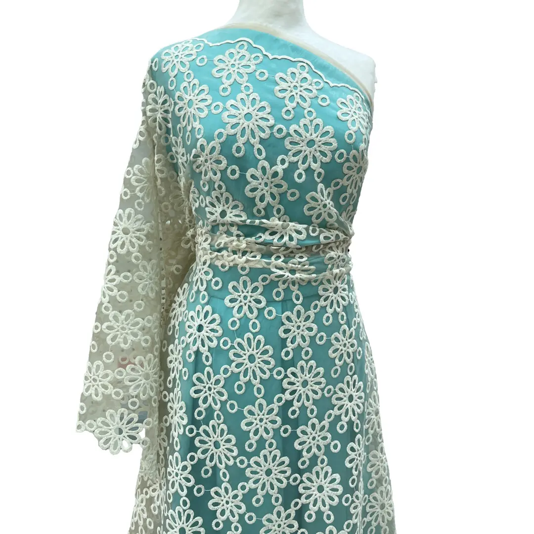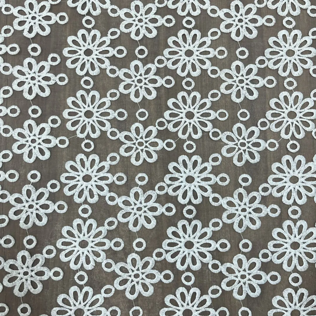 Il ricamo, realizzato con filato spesso e opaco si sviluppa in un disegno floreale stilizzato di grandi dimensioni, con fiori composti da petali circolari che ricordano margherite, collegati tra loro da piccoli anelli ricamati che creano una rete regolare e armoniosa su tutta la superficie del tessuto.
