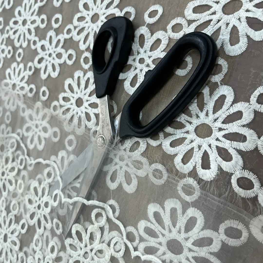 Dal punto di vista tecnico, il tessuto offre una discreta elasticità trasversale dovuta alla struttura aperta del pizzo e dalla base a trama larga in organza, mentre la stabilità dimensionale è garantita dalla qualità della base e dalla densità del ricamo.