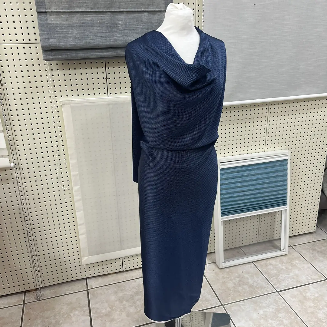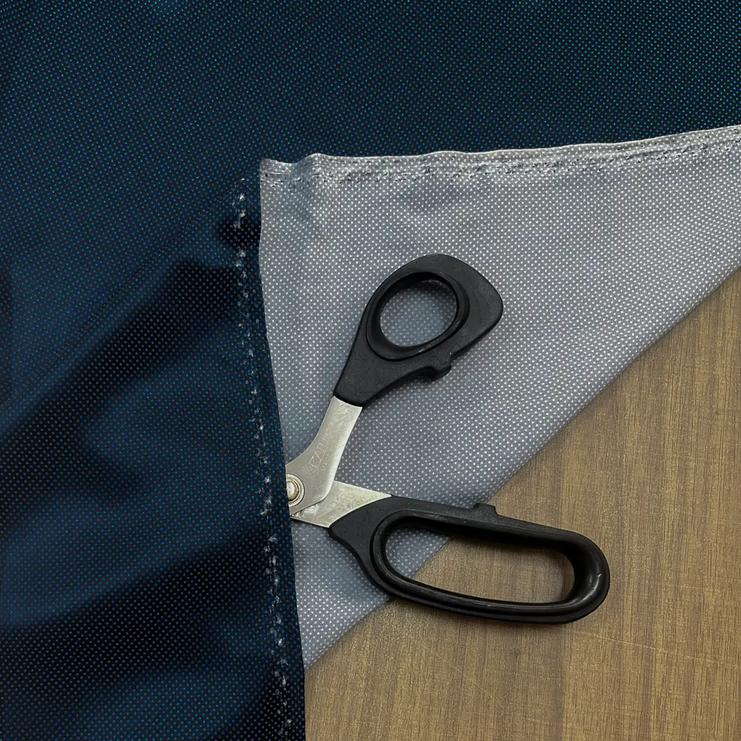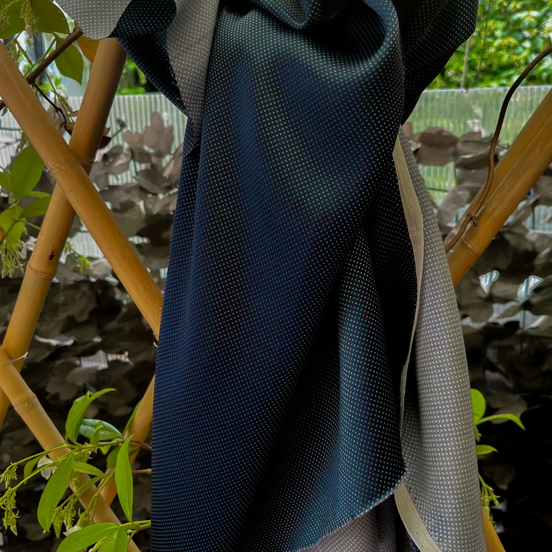 La base cromatica di questo tessuto è un blu navy intenso, una tonalità profonda e ricercata, arricchita da una trama di piccoli punti più chiari, che appartengono a sfumature di blu ardesia.