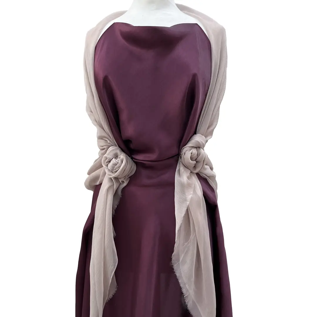 Il raso, grazie alla densità della tessitura e alla qualità della seta, mostra una caduta morbida ma mai priva di struttura, mantenendo forma e definizione anche nelle creazioni più elaborate.
