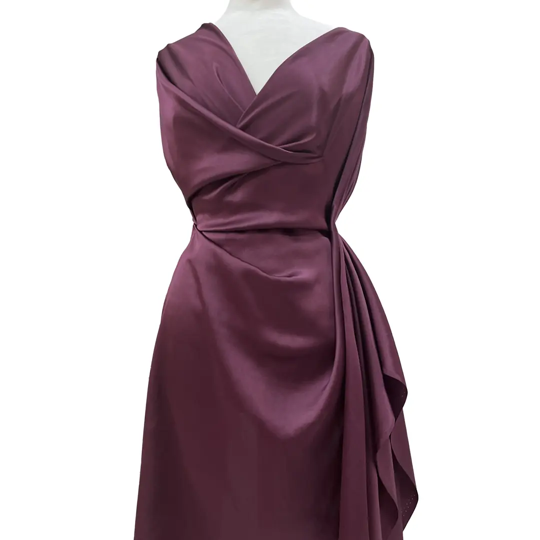 Il raso di pura seta italiana viola melanzana sidistingue per la sua eleganza sofisticata e la luminosità profonda che regala un aspetto sontuoso alla stoffa.