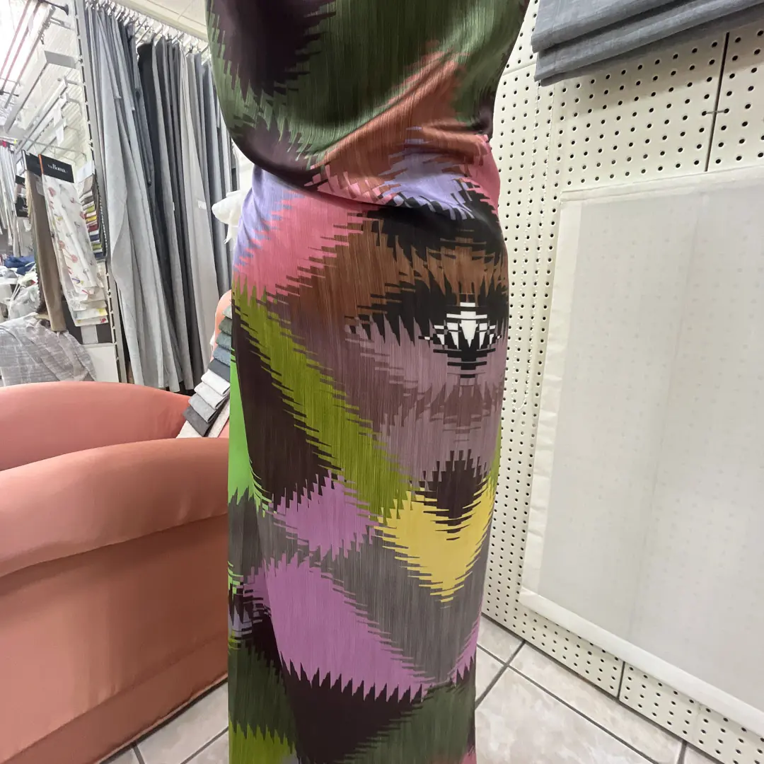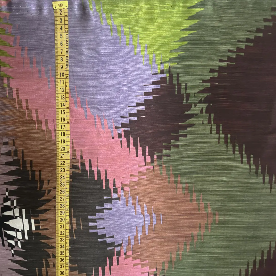 La disposizione dei colori in linee frastagliate o a zigzag dona alla stoffa un carattere moderno e audace, valorizzando la sua estetica unica.