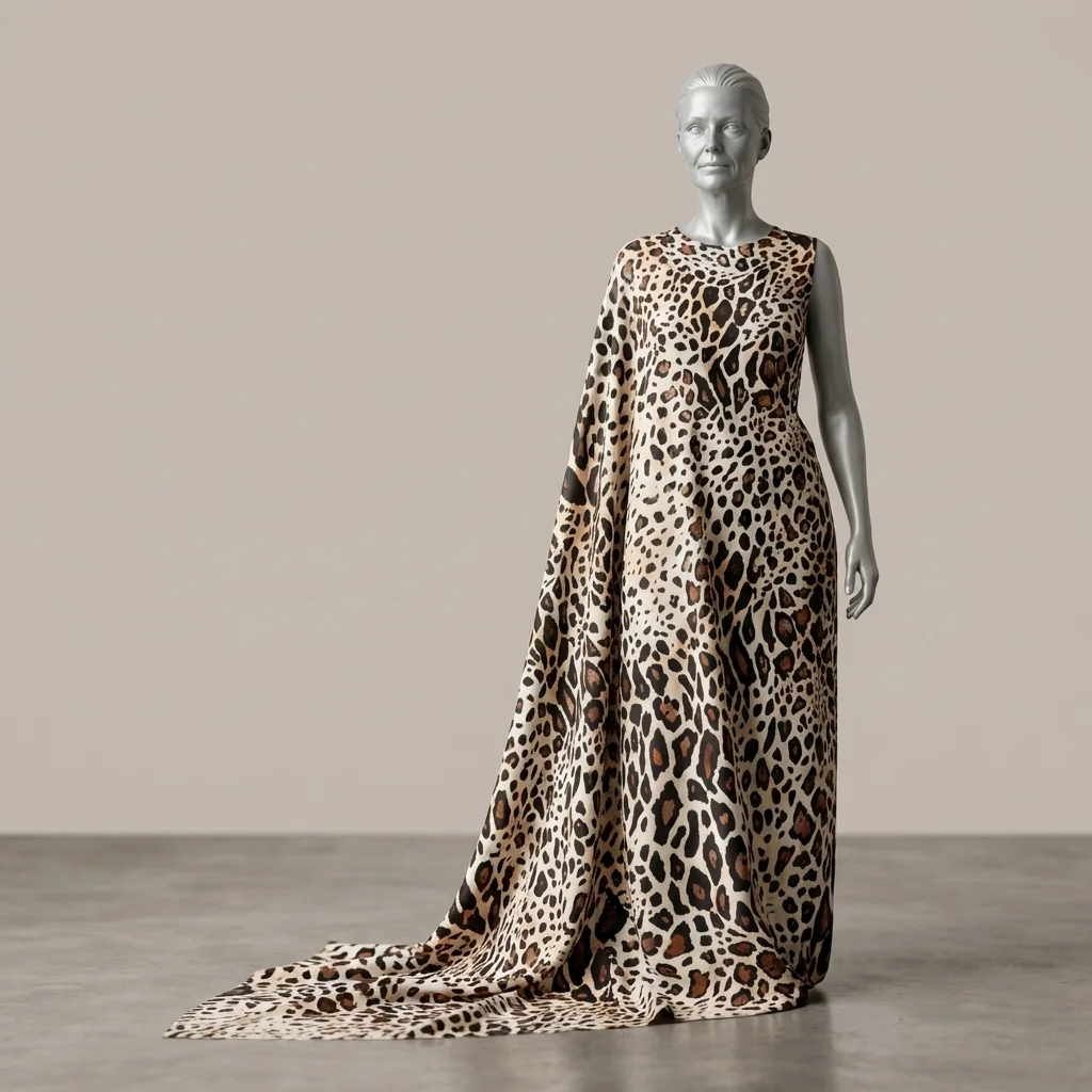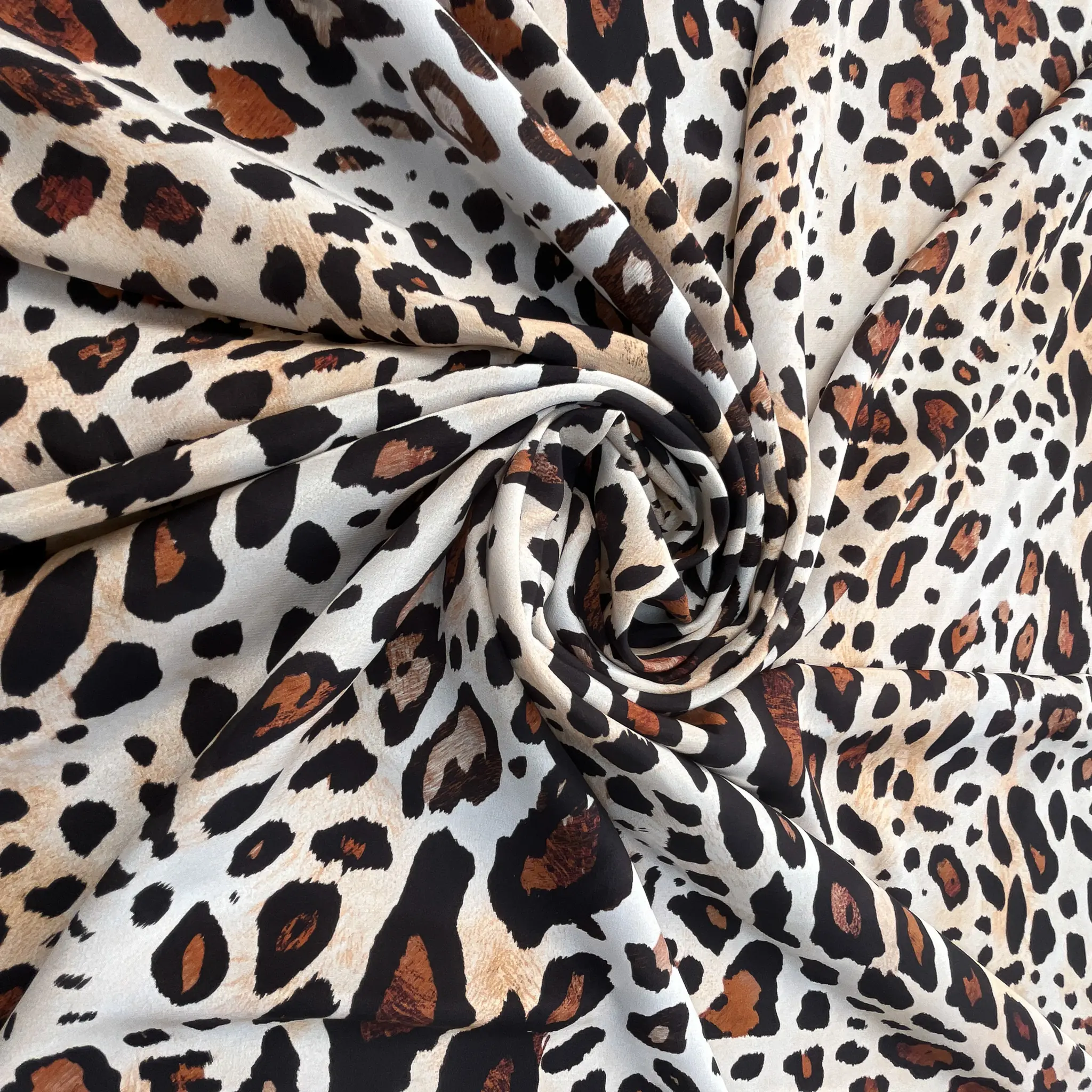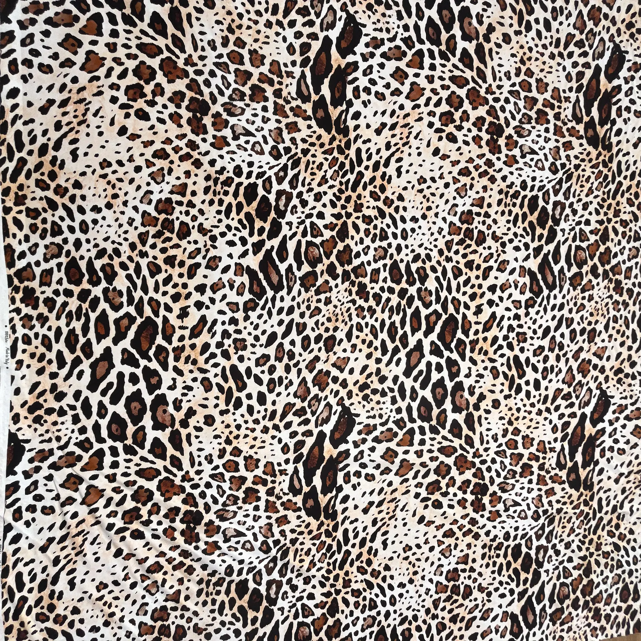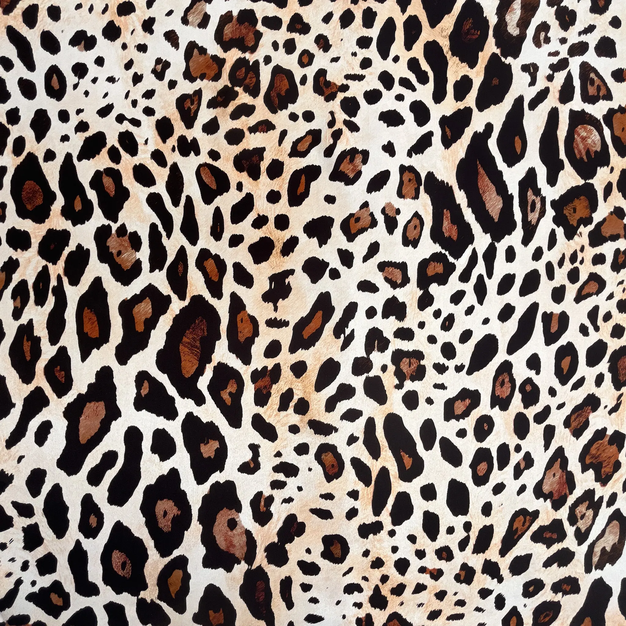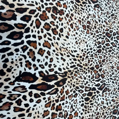 Raso in pura seta d’abbigliamento con stampa animalier dal fondo avorio caldo, su cui si distribuisce un motivo maculato irregolare nei toni del nero profondo, del marrone bruciato e del cammello sfumato.