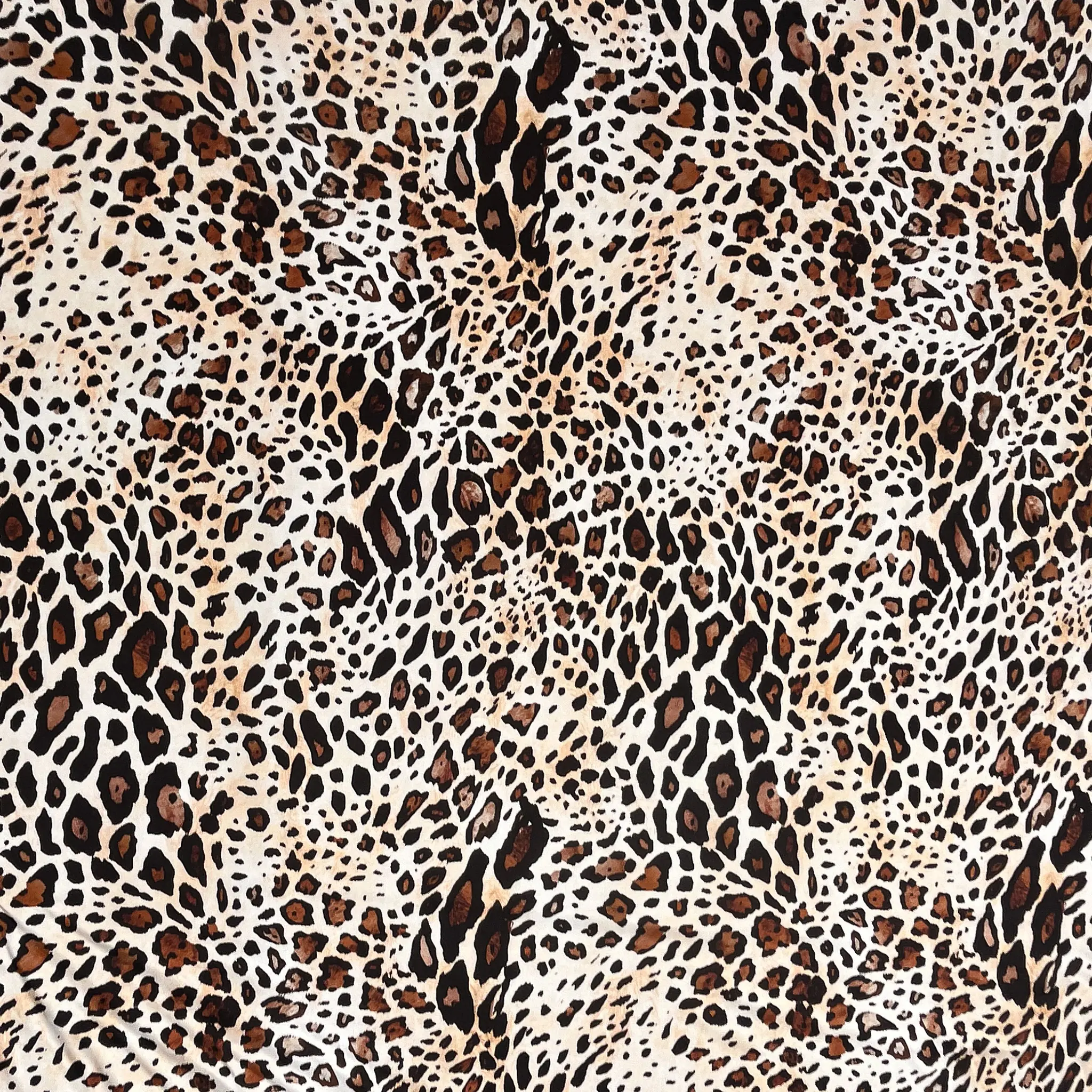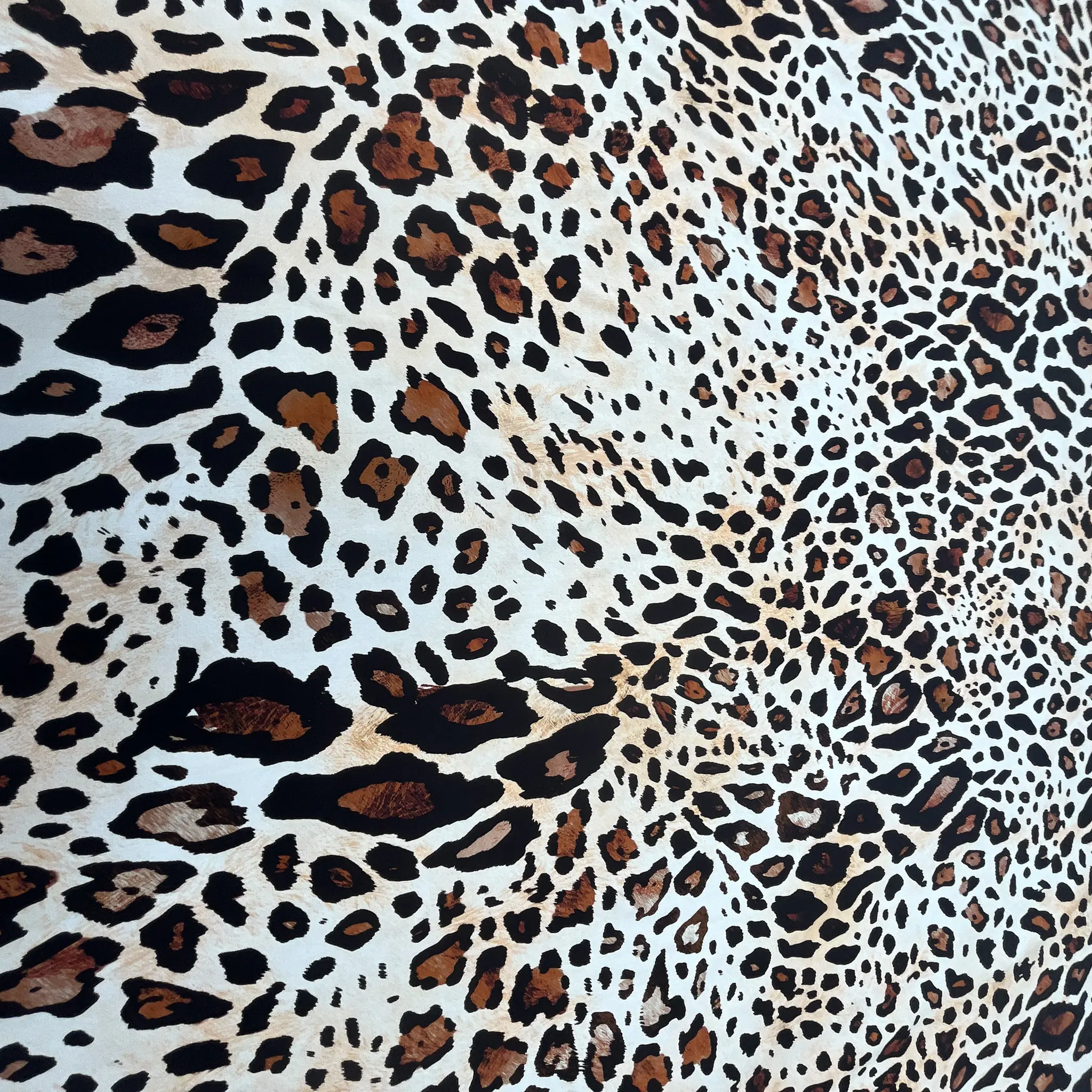 Le chiazze sono di dimensioni variabili, più fitte e minute nelle zone centrali e leggermente più grandi verso i bordi, creando un effetto visivo dinamico e leggermente vorticoso che ricorda il manto di un leopardo reinterpretato in chiave moda.