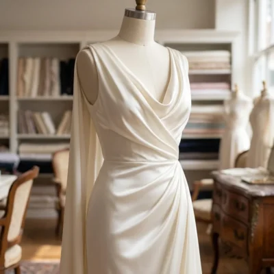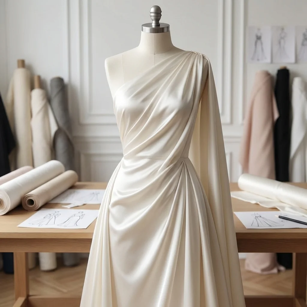 Questo raso di seta bianco avorio lucido è particolarmente indicato per collezioni sposa e cerimonia, ma anche per camicie raffinate, top eleganti e dettagli sartoriali come fusciacche, fiocchi e inserti lucidi su capi strutturati.