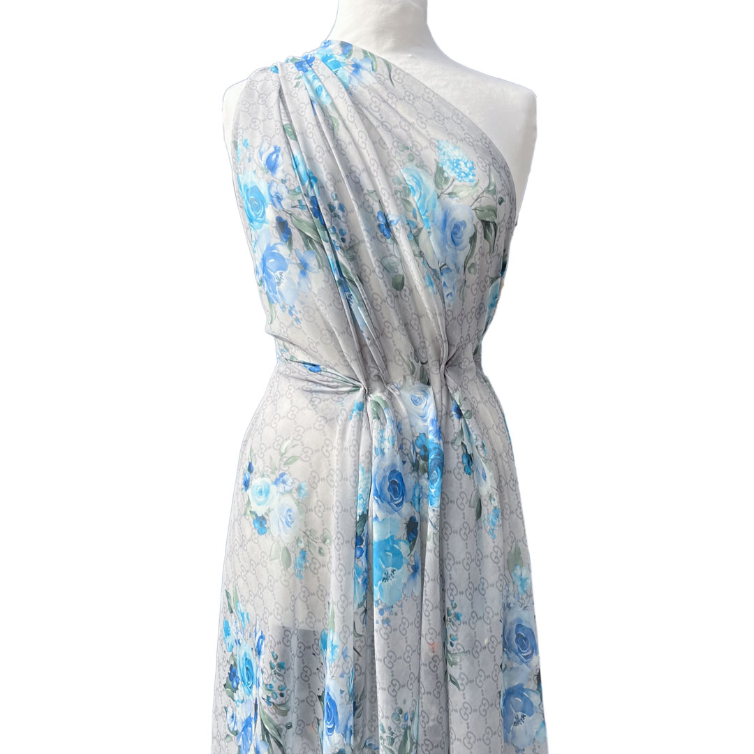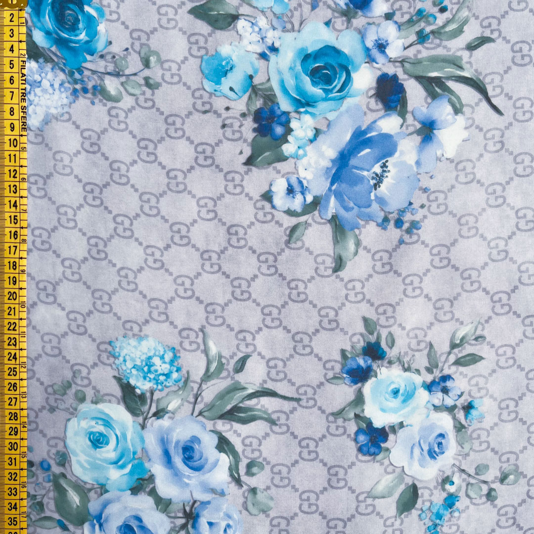 Scampolo di chiffon in pura Seta firmato a fantasia floreale dai toni freddi, dal grigio al blu