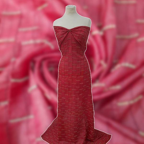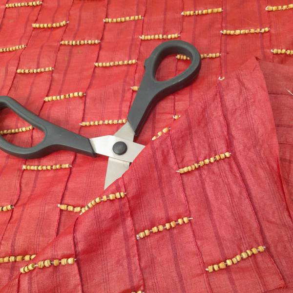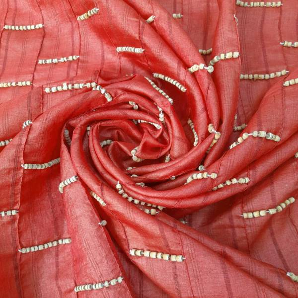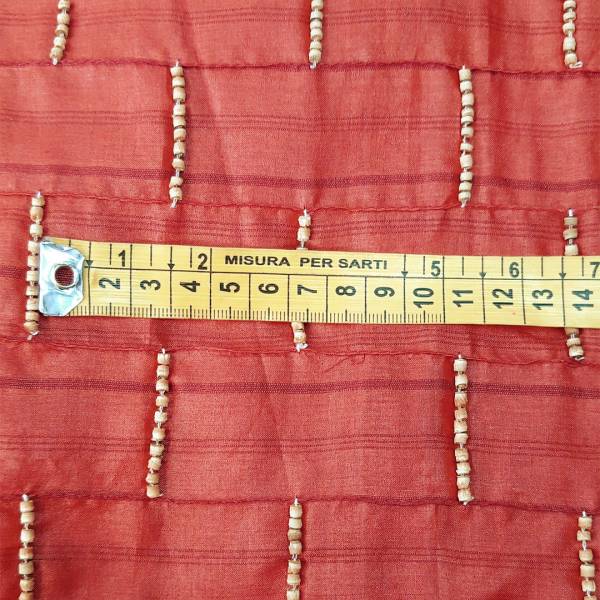 Particolare tessuto in seta di colore rosso con applicazioni in rilievo di “corallini” di legno, che danno un tocco di originalità al tessuto.
