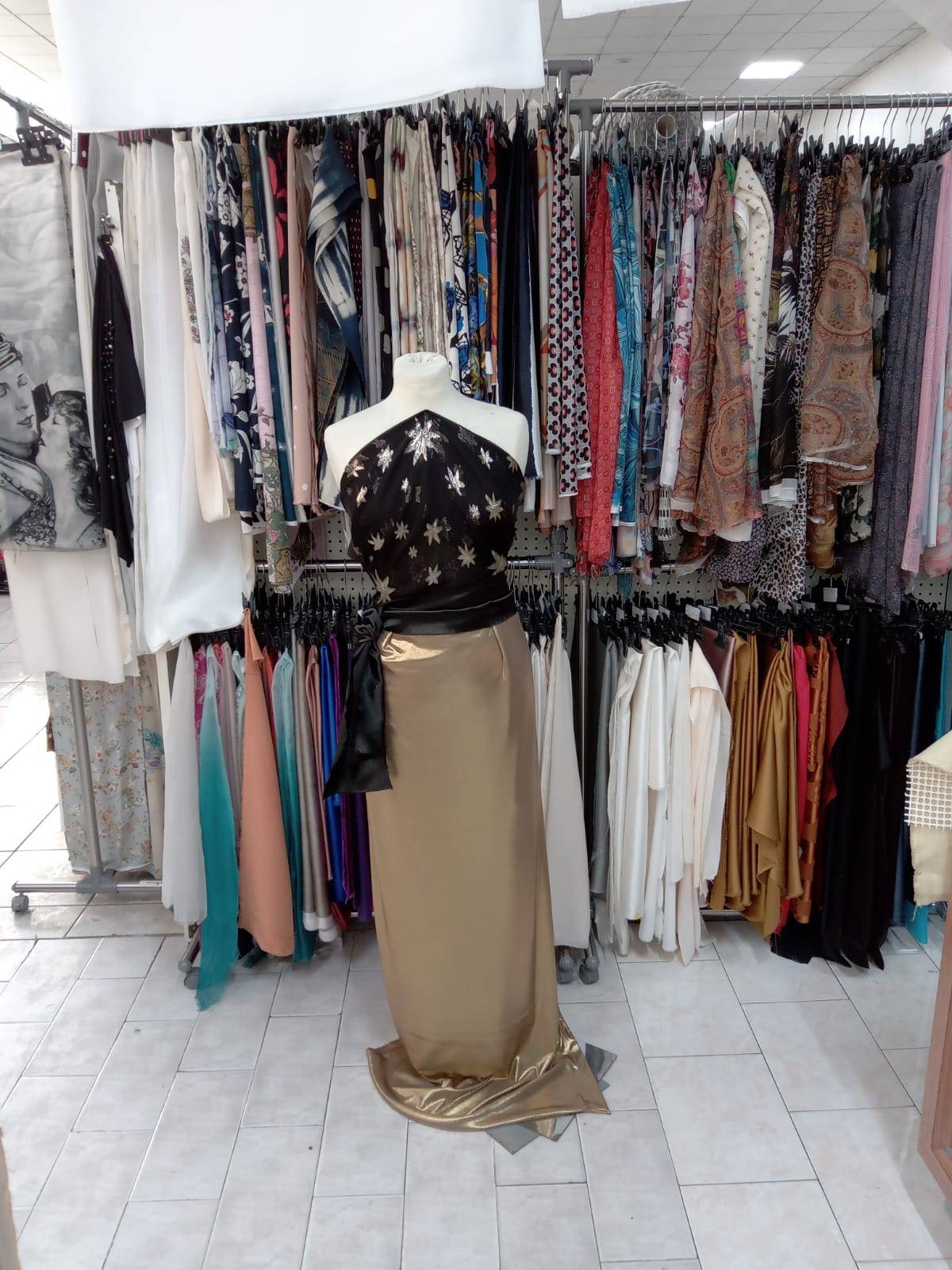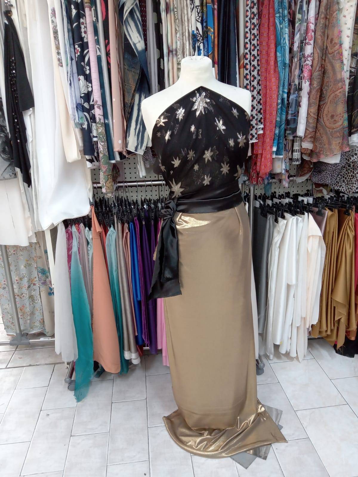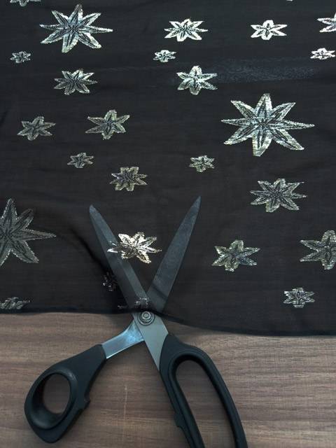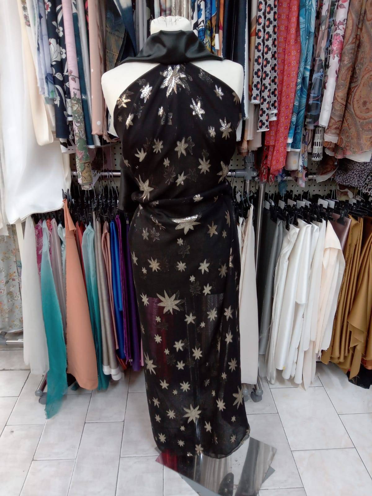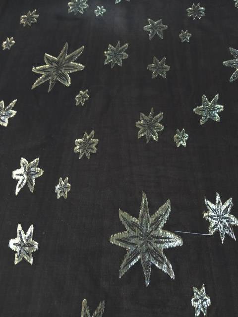Tessuto d’abbigliamento in pura seta a fantasia stelle nere oro