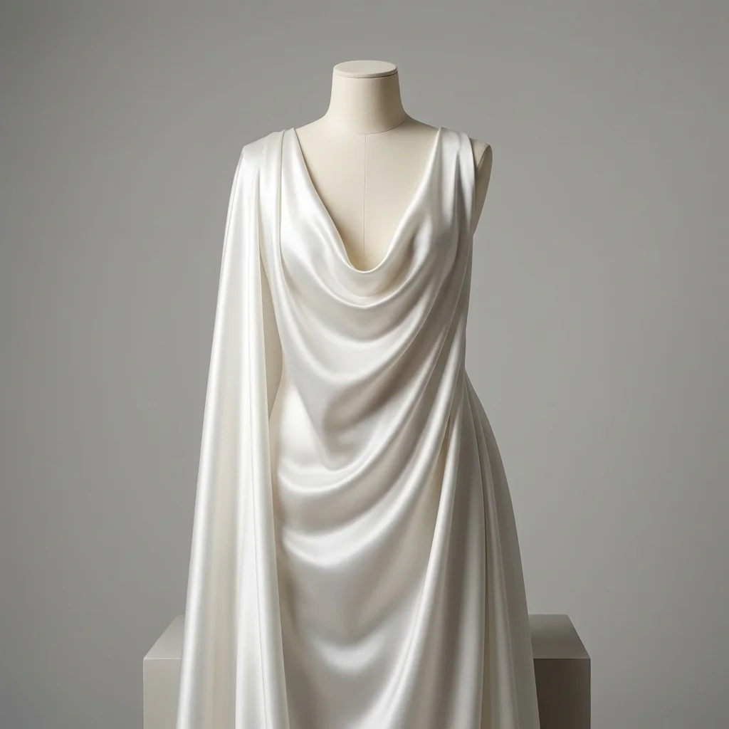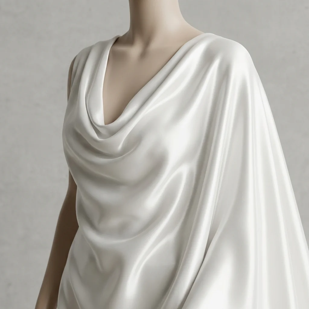 Tessuto d’abbigliamento in raso di pura seta dal colore bianco luminoso, con una leggera sfumatura calda che lo rende morbido alla vista e mai freddo come un ottico.