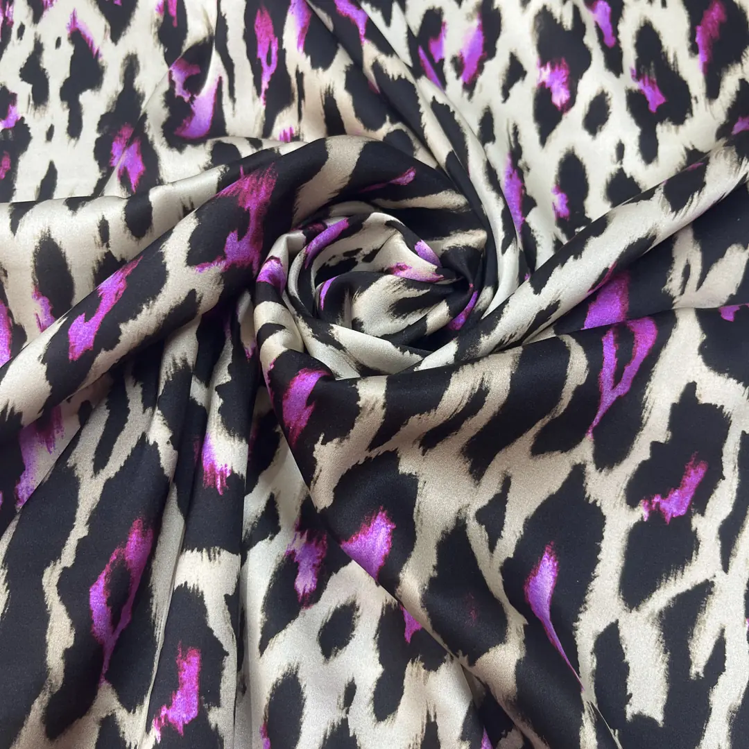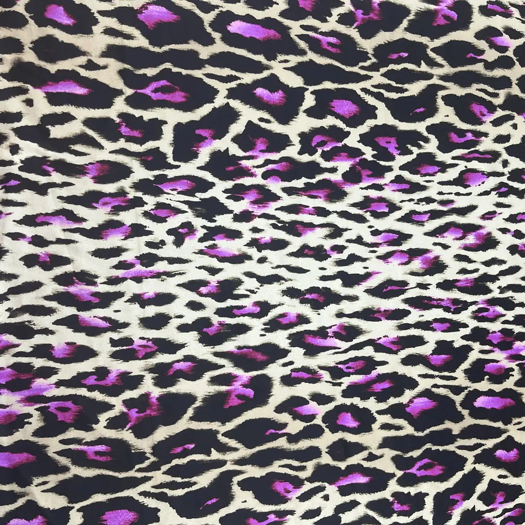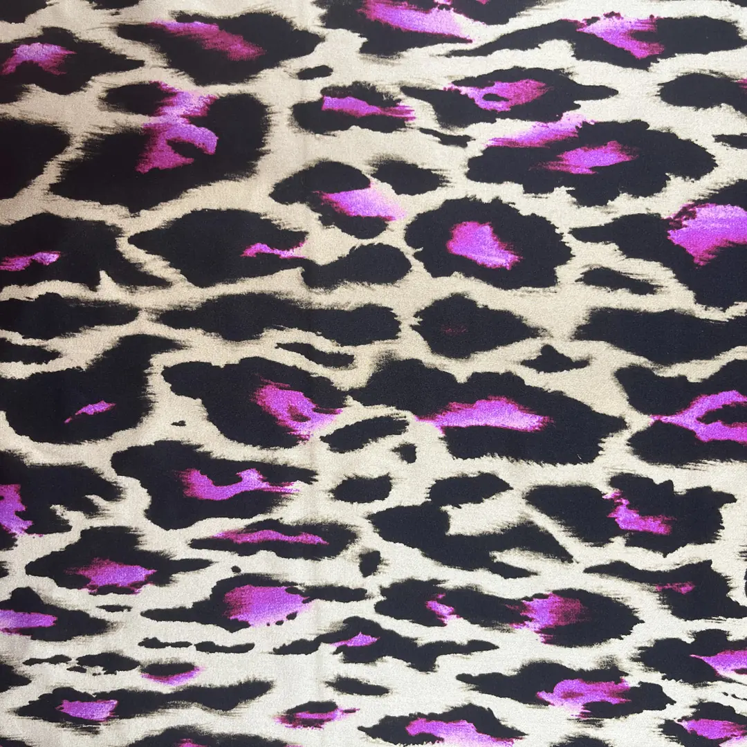 Raso di seta elasticizzato con stampa leopardata nera e viola ciclamino