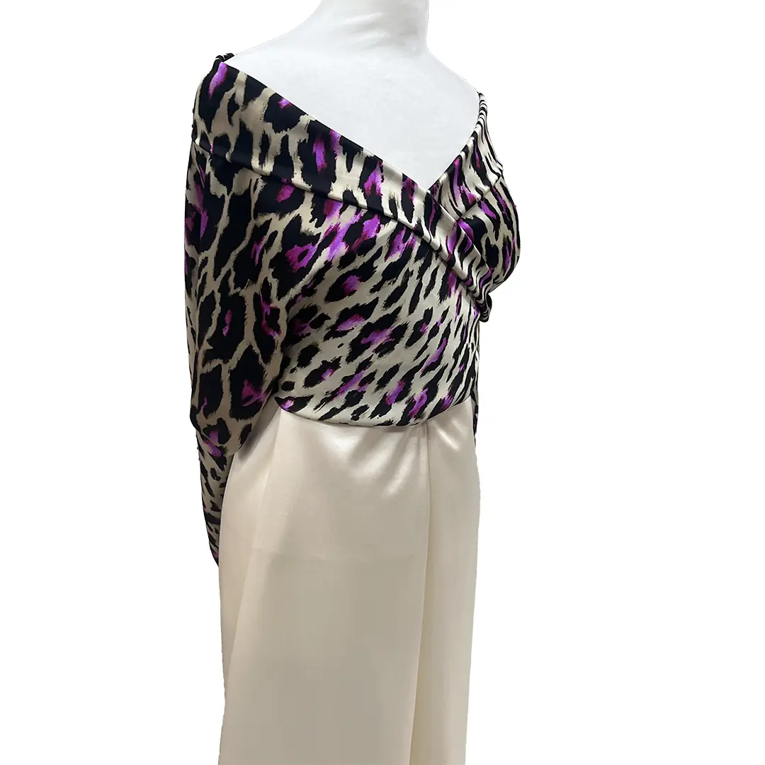 Questo tessuto è un elegante raso di seta stretch caratterizzato da una stampa leopardata contemporanea, resa unica dagli accenti in viola ciclamino che emergono tra le macchie nere e il fondo beige dorato.