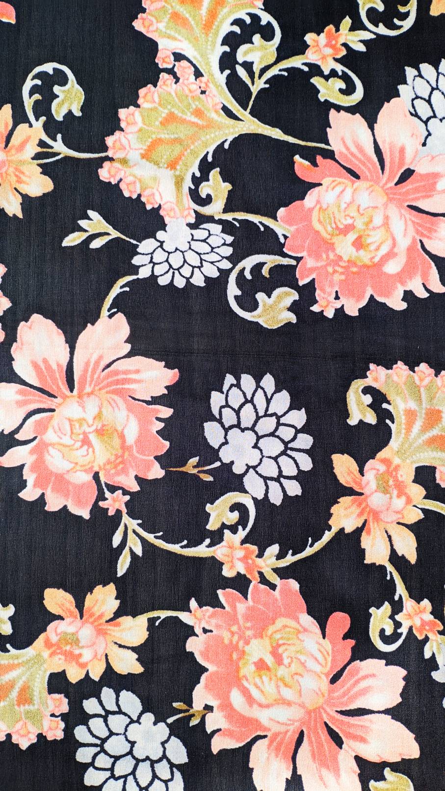 Il tessuto presenta una splendida fantasia floreale esotica, ricca di dettagli e colori vivaci, che si stagliano su uno sfondo nero profondo e sofisticato.